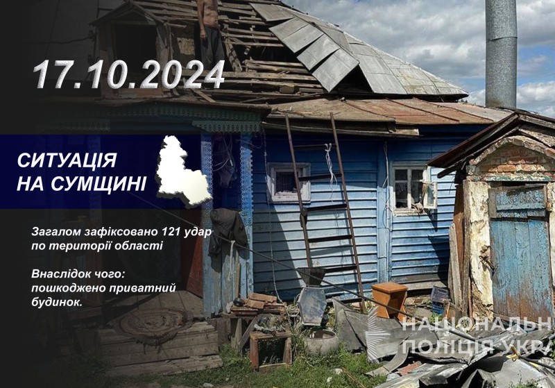 За минулу добу російські окупанти з різних видів зброї обстріляли 30 населених пунктів Сумської області. Загалом нараховано 121 удар.