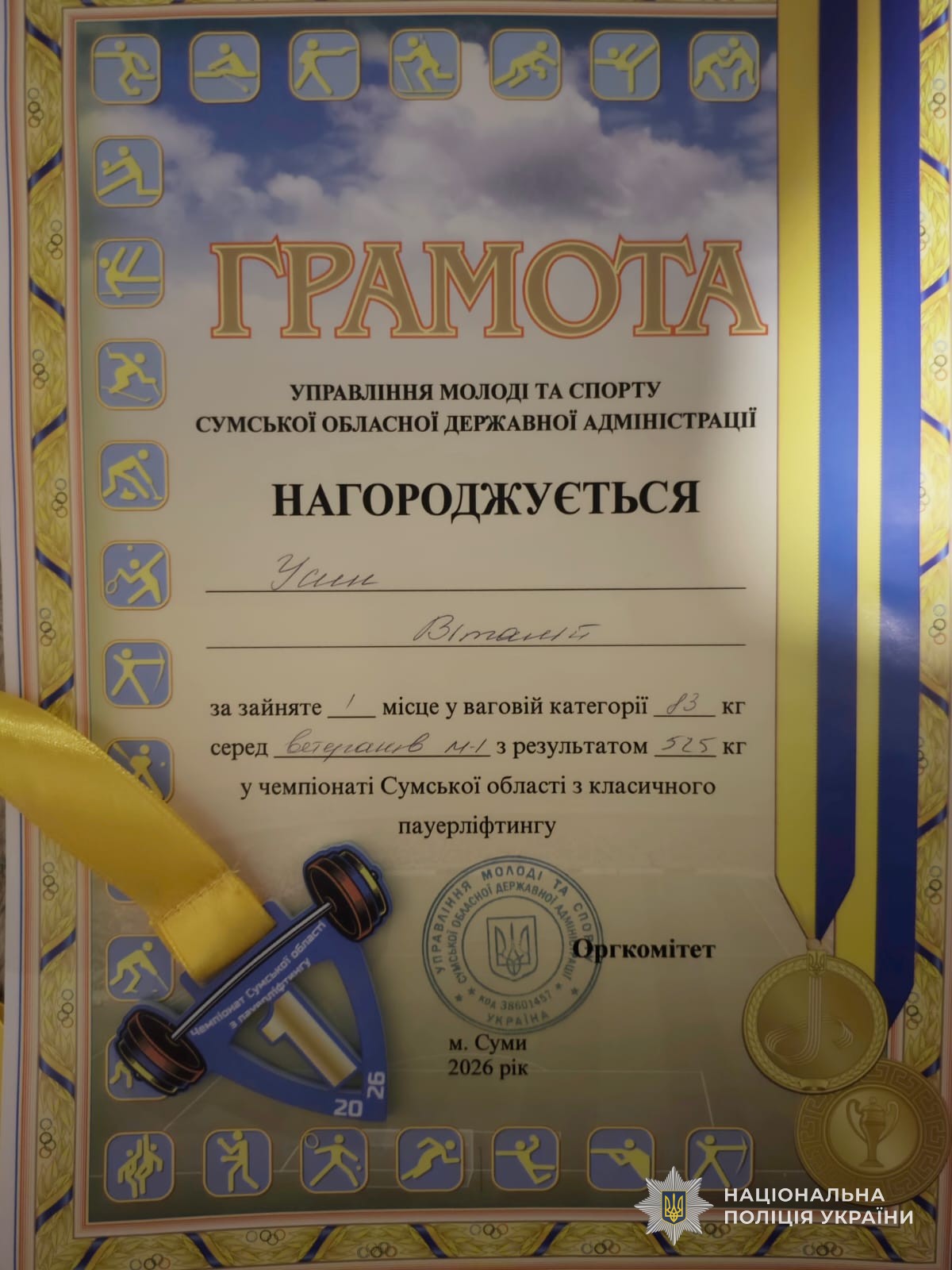 У змаганнях серед досвідчених спортсменів правоохоронець продемонстрував відмінну фізичну підготовку, витривалість та силу духу. Цього разу він виступав у ваговій категорії до 83 кілограмів і впевнено подолав штангу в сумі трьох вправ вагою 525 кілограмів, що й забезпечило йому першу сходинку п’єдесталу.