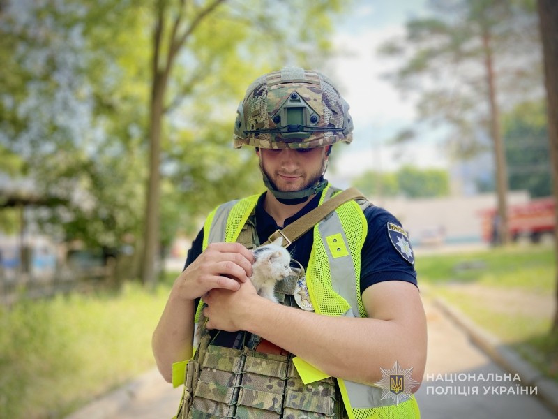 Під час огляду зруйнованих будівель один з правоохоронців почув слабке нявкання з-під завалів. Не одразу, але все ж таки поліцейський віднайшов малого пухнастика. Його обережно дістали, напоїли водою та передали в надійні руки.
