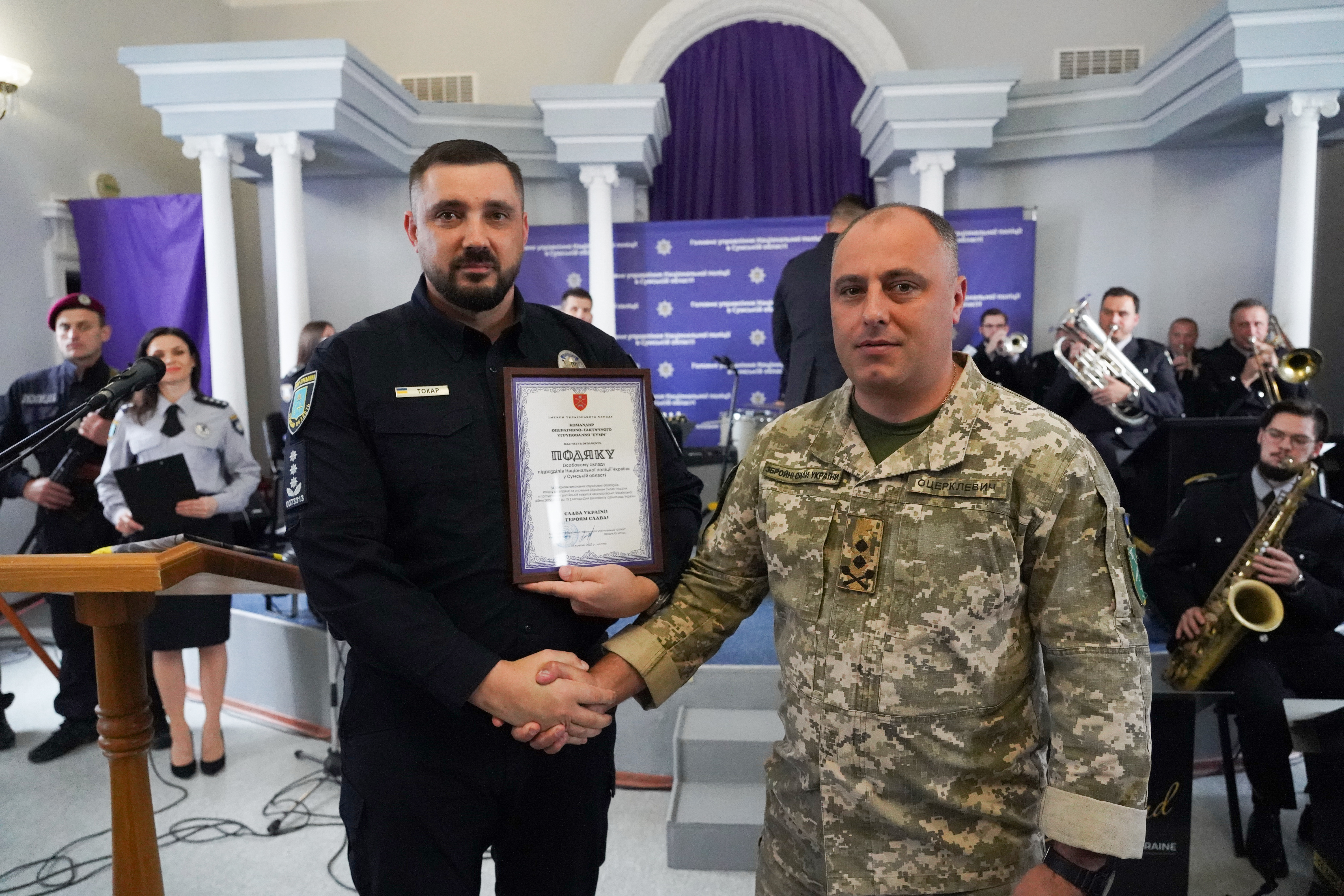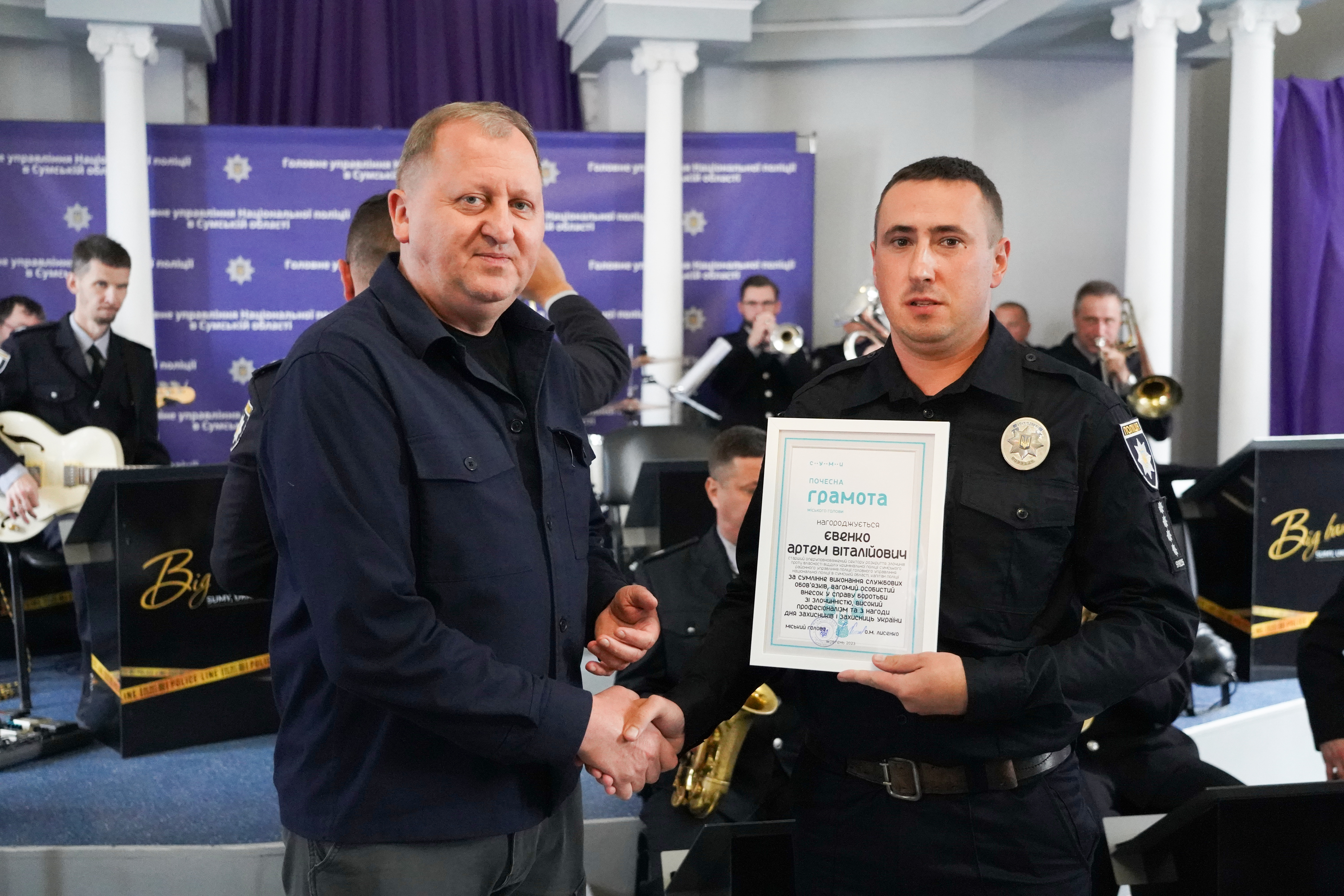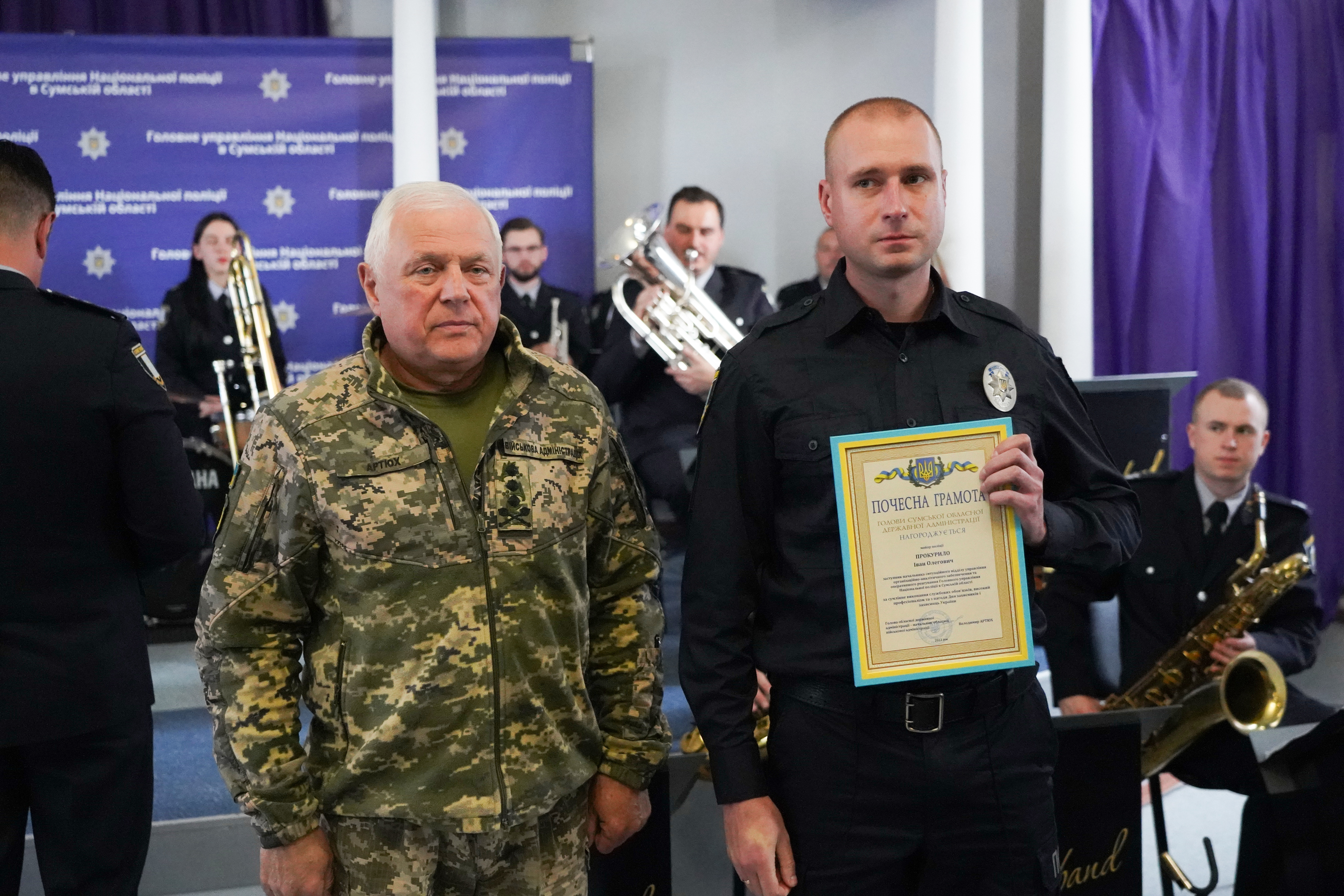 До заходів долучились голова Сумської обласної військової адміністрації Володимир Артюх, командир оперативно-тактичного угруповання «Суми» Василь Осипчук та міський голова Олександр Лисенко. Гості привітали поліцейських та нагородили почесними грамотами, пам’ятними знаками, подяками.