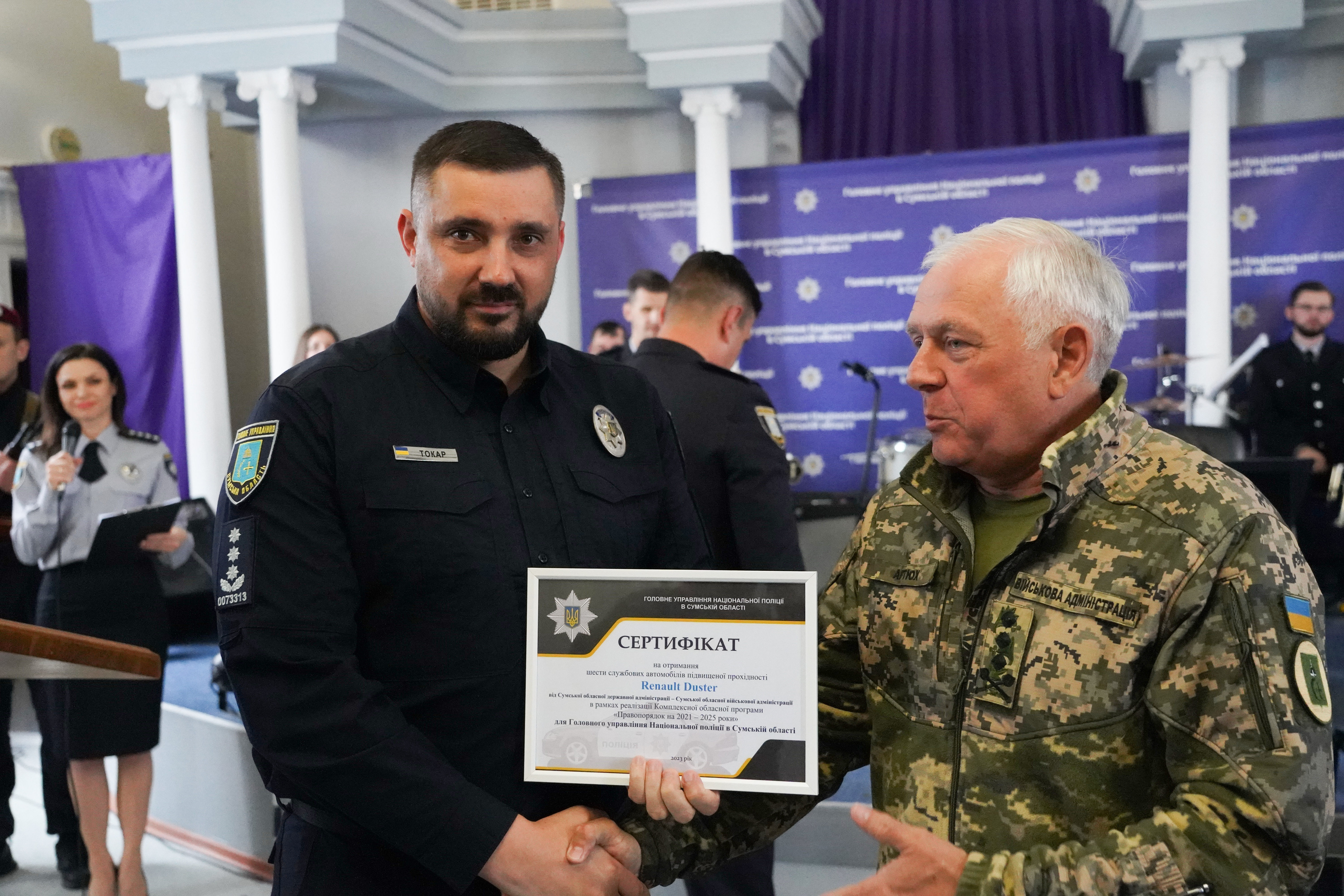 Окрім того, правоохоронці отримали сертифікат на шість службових автомобілів підвищеної прохідності «Renault Duster» від Сумської обласної військової адміністрації в рамках реалізації Комплексної обласної програми «Правопорядок на 2021 – 2025 роки. Завдяки підтримці з боку місцевого самоврядування поліцейські мають змогу ще ефективніше виконувати щоденні обовязки та забезпечувати правопорядок у регіоні.