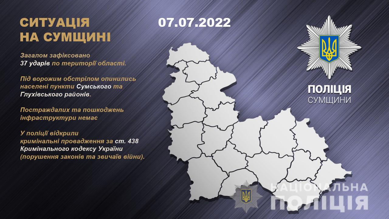 Ворог обстріляв смт Краснопілля, с. Миропілля, Хмелівка, Юнаківка, Іскрисківщина Сумського району та с. Студенок Глухівського району. Загалом нараховано 37 приходів. На місці працюють поліцейські.