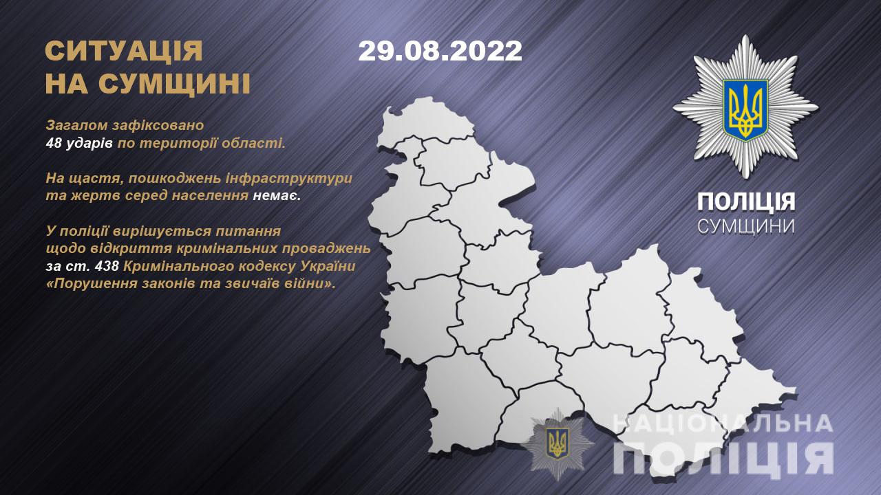 Протягом минулої доби ворог здійснив 48 ударів по території Сумської області. На щастя, пошкоджень інфраструктури та жертв серед населення немає.