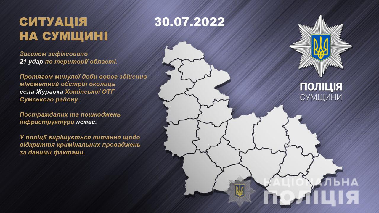 Протягом минулої доби ворог здійснив мінометний обстріл околиць села Журавка Хотінської ОТГ Сумського району.