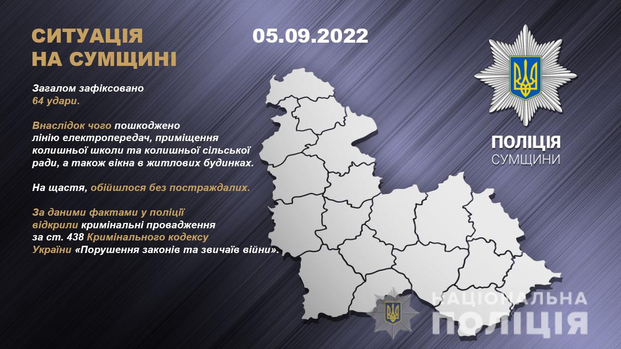 Протягом минулої доби ворог обстріляв територію Сумської області. Загалом нараховано 64 удари.