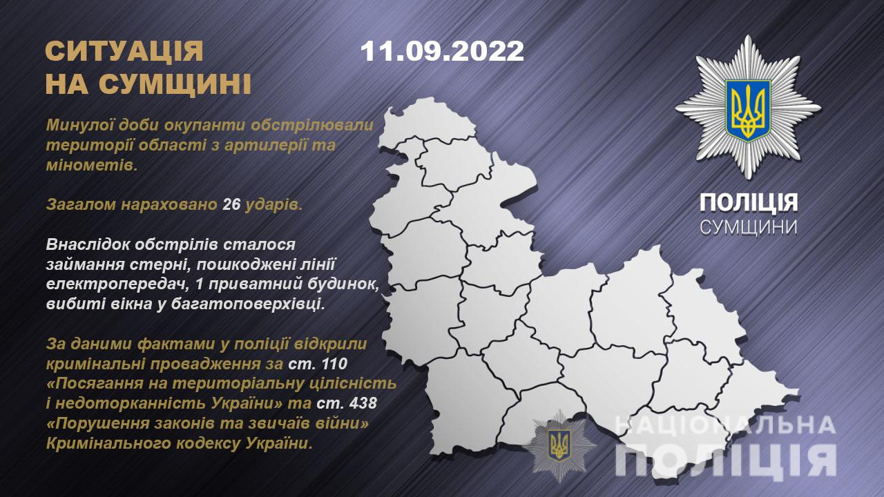 Минулої доби окупанти обстрілювали території області з артилерії та мінометів. Загалом нараховано 26 ударів.