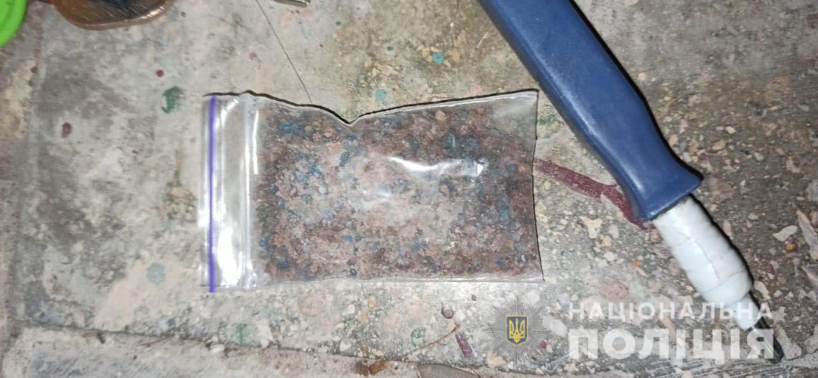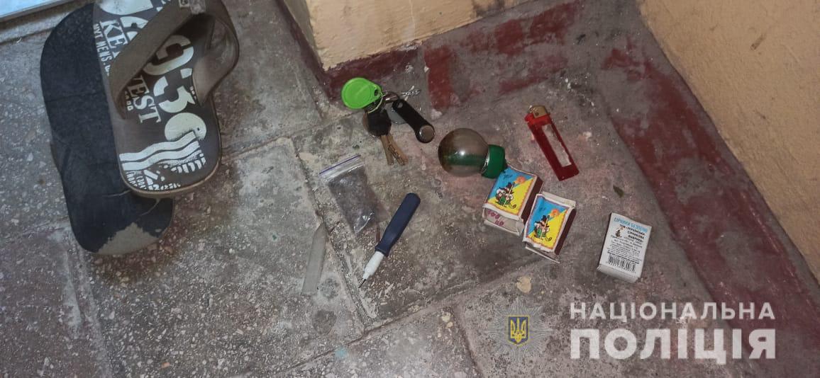 Біля одного з будинків по вулиці Заливна в місті Суми, при поверхневій перевірці, дільничний офіцер поліції виявила у 18-річного місцевого жителя згорток з кристалічною речовиною вагою приблизно 0,5 грамів та скляну колбу з нашаруванням коричневого кольору.
