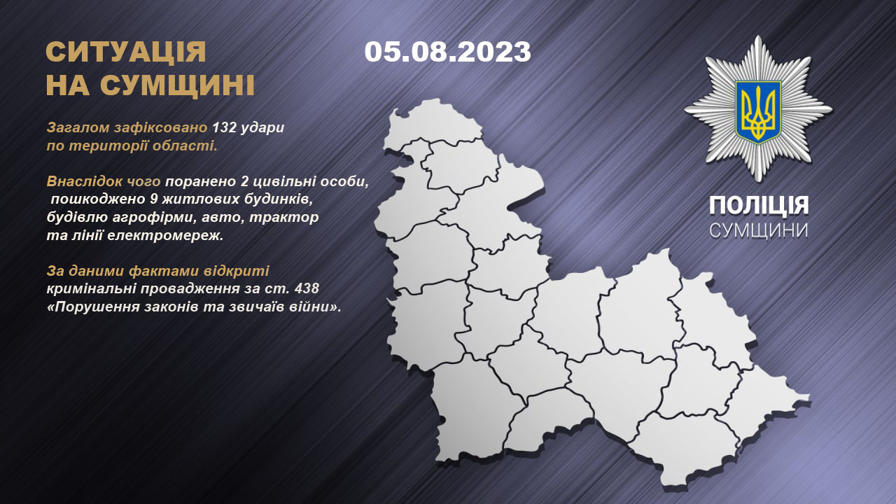 Протягом минулої доби окупанти обстріляли населені пункти Сумської області. Загалом нараховано 132 удари.