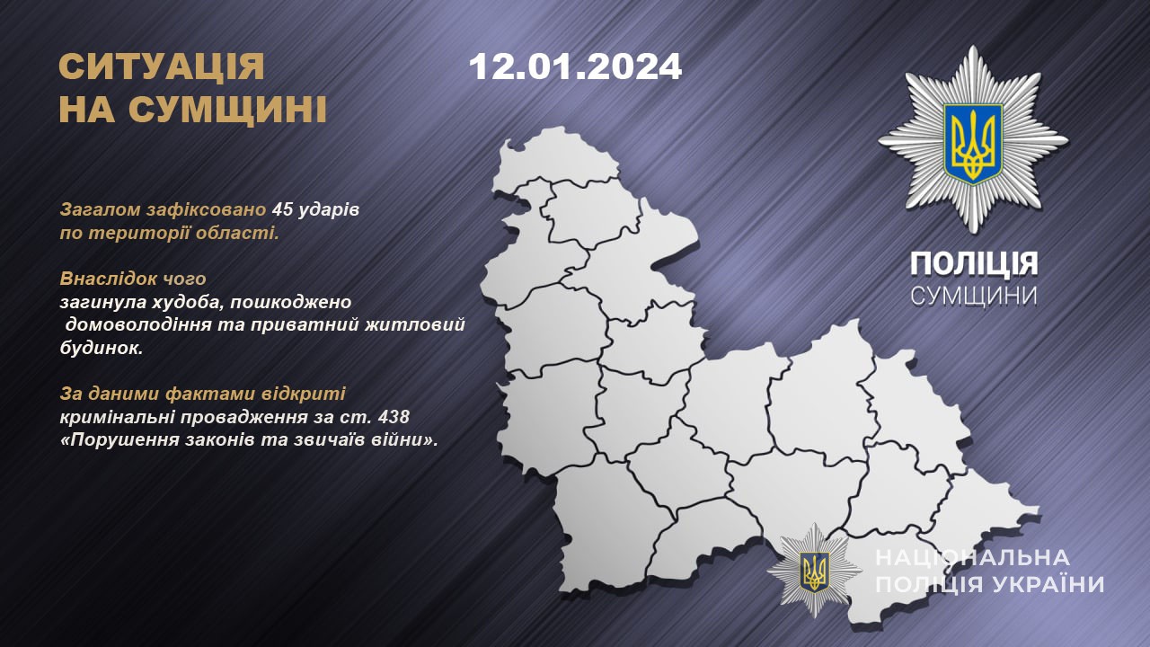 Протягом минулої доби окупанти обстріляли населені пункти Сумської області. Загалом нараховано 45 ударів.