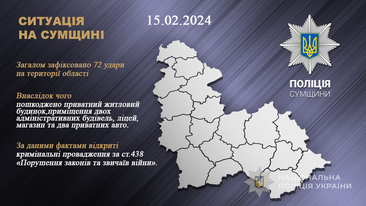 Протягом минулої доби окупанти обстріляли населені пункти Сумської області. Загалом нараховано 72 удари.