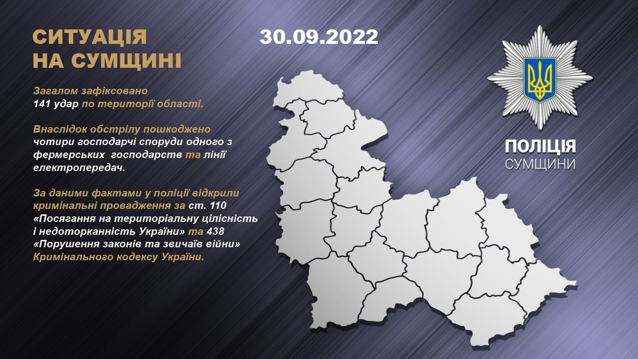 Протягом минулої доби ворог обстріляв населені пункти Сумської області. Загалом нараховано 141 удар.