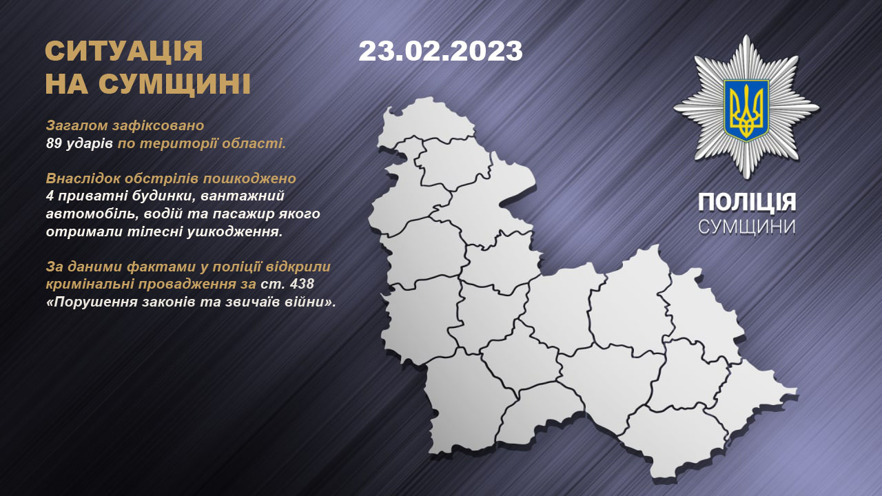 Протягом минулої доби окупанти обстріляли населені пункти Сумської області. Загалом нараховано 89 ударів.