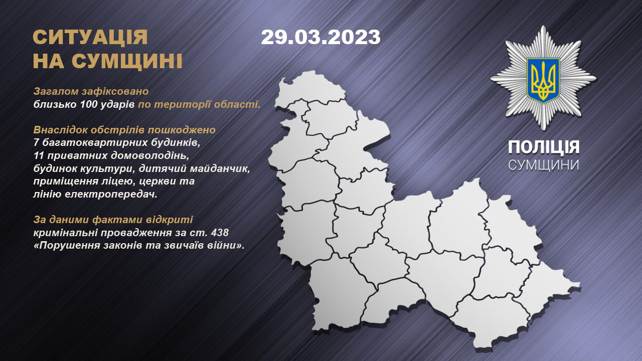 Протягом минулої доби війська рф знову обстрілювали прикордонні населені пункти області. Загалом зафіксовано більше 100 ударів.