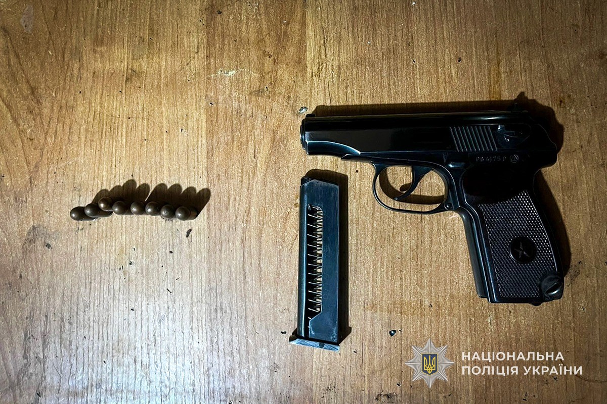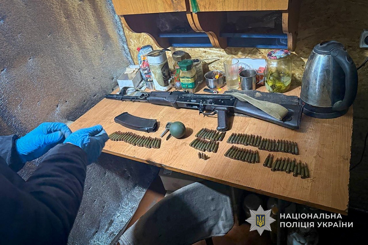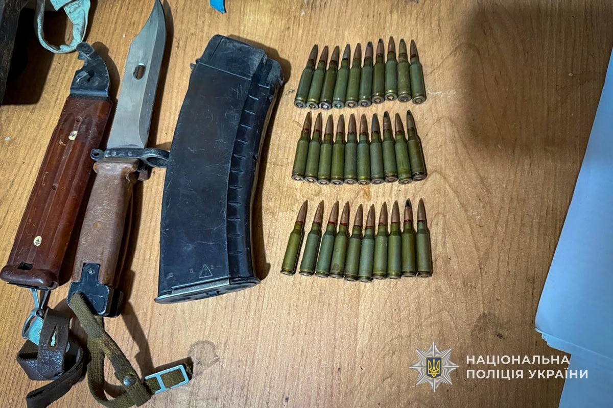 Під час проведення санкціонованого обшуку поліцейські виявили та вилучили автомат АК-74 із магазинами, пістолет ПМ, осколково-наступальну гранату, а також понад 140 патронів різного калібру.