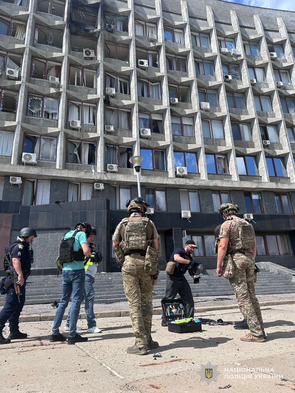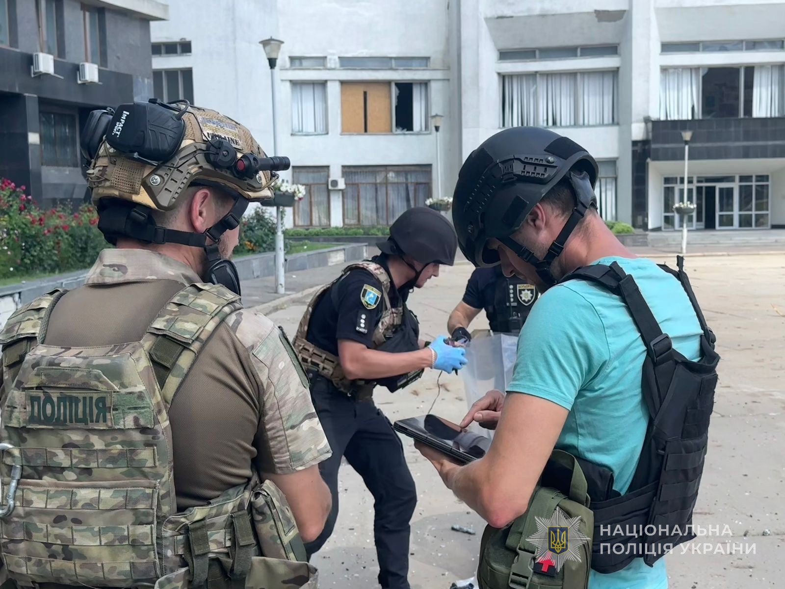 Слідчі та вибухотехніки поліції оглядають місце події, збирають речові докази, фіксують масштаби руйнувань та здійснюють фото- та відеофіксацію.