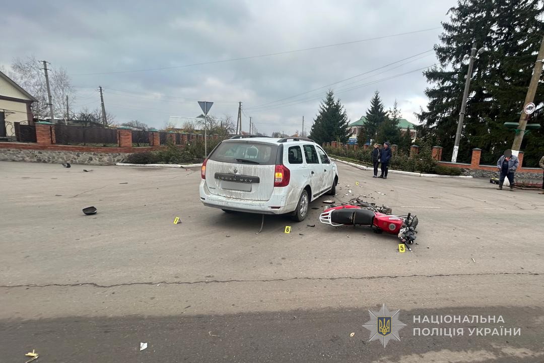 У результаті зіткнення 20-річний водій мотоцикла, отримав тілесні ушкодження. Потерпілого госпіталізовано до Охтирської центральної районної лікарні.