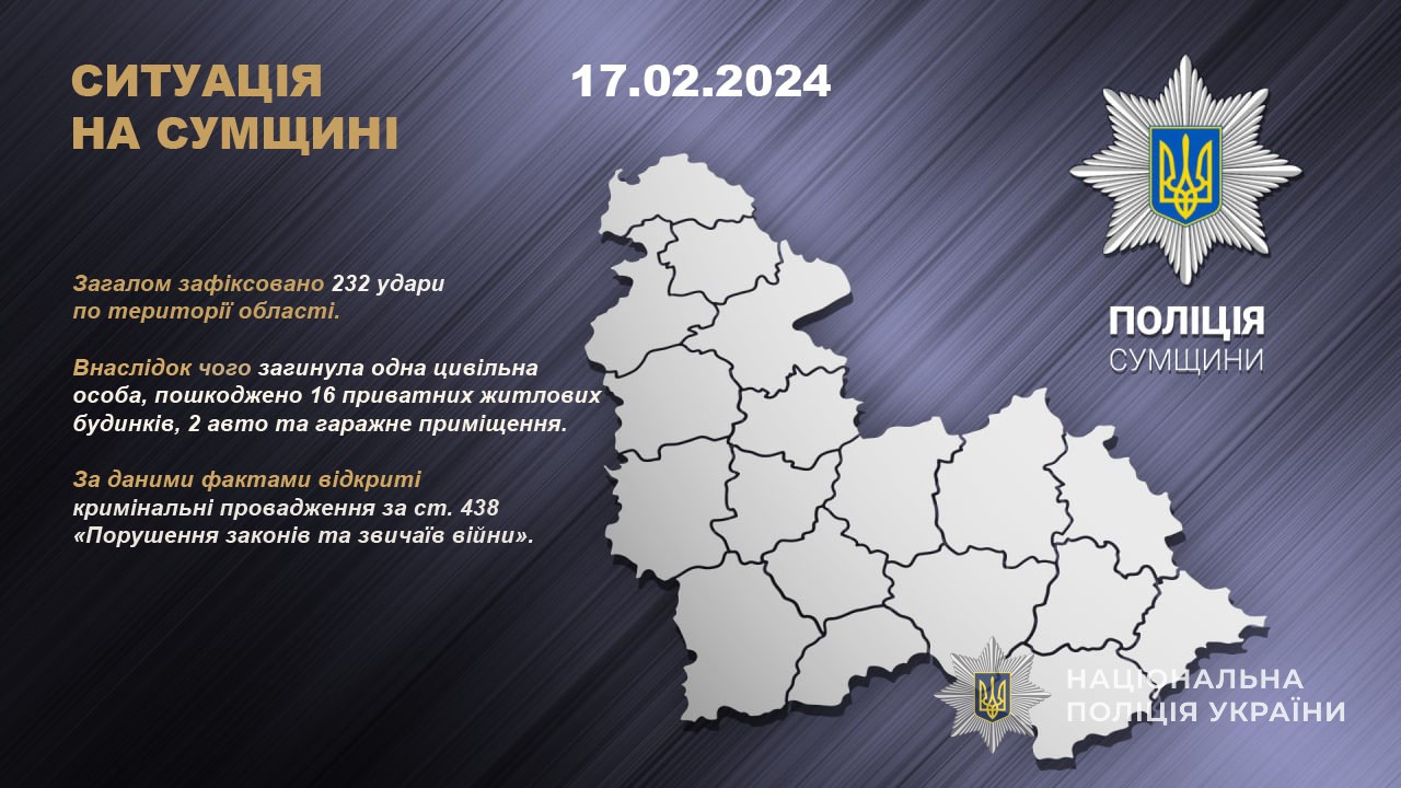 Протягом минулої доби окупанти обстріляли прикордонні населені пункти Сумської області. Загалом нараховано 232 удари.
