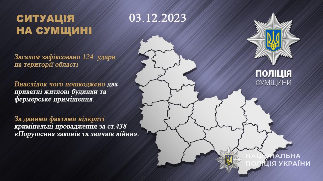 Протягом минулої доби окупанти обстріляли прикордонні населені пункти Сумської області. Загалом нараховано 124 удари.
