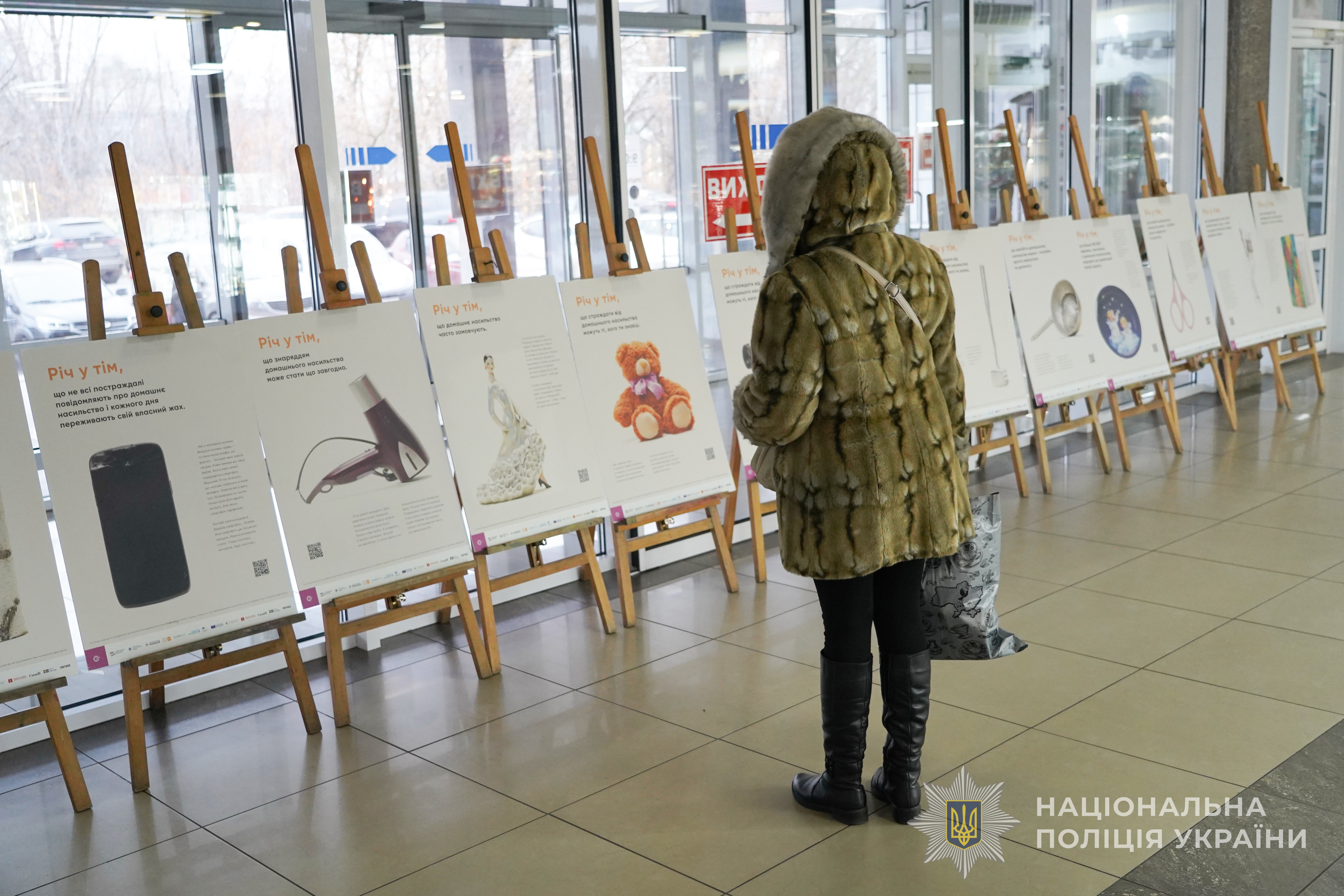 «На кожному з них зображені предмети, що пов’язані з реальними історіями домашнього насильства. Зчитавши спеціальний код за допомогою телефонного додатку, будь-яка людина має можливість почути розповідь про справжній випадок із життя потерпілого від насильства», - говорить старший інспектор з особливих доручень Департаменту головної інспекції та дотримання прав людини Національної поліції України Євгеній Євтєєв.