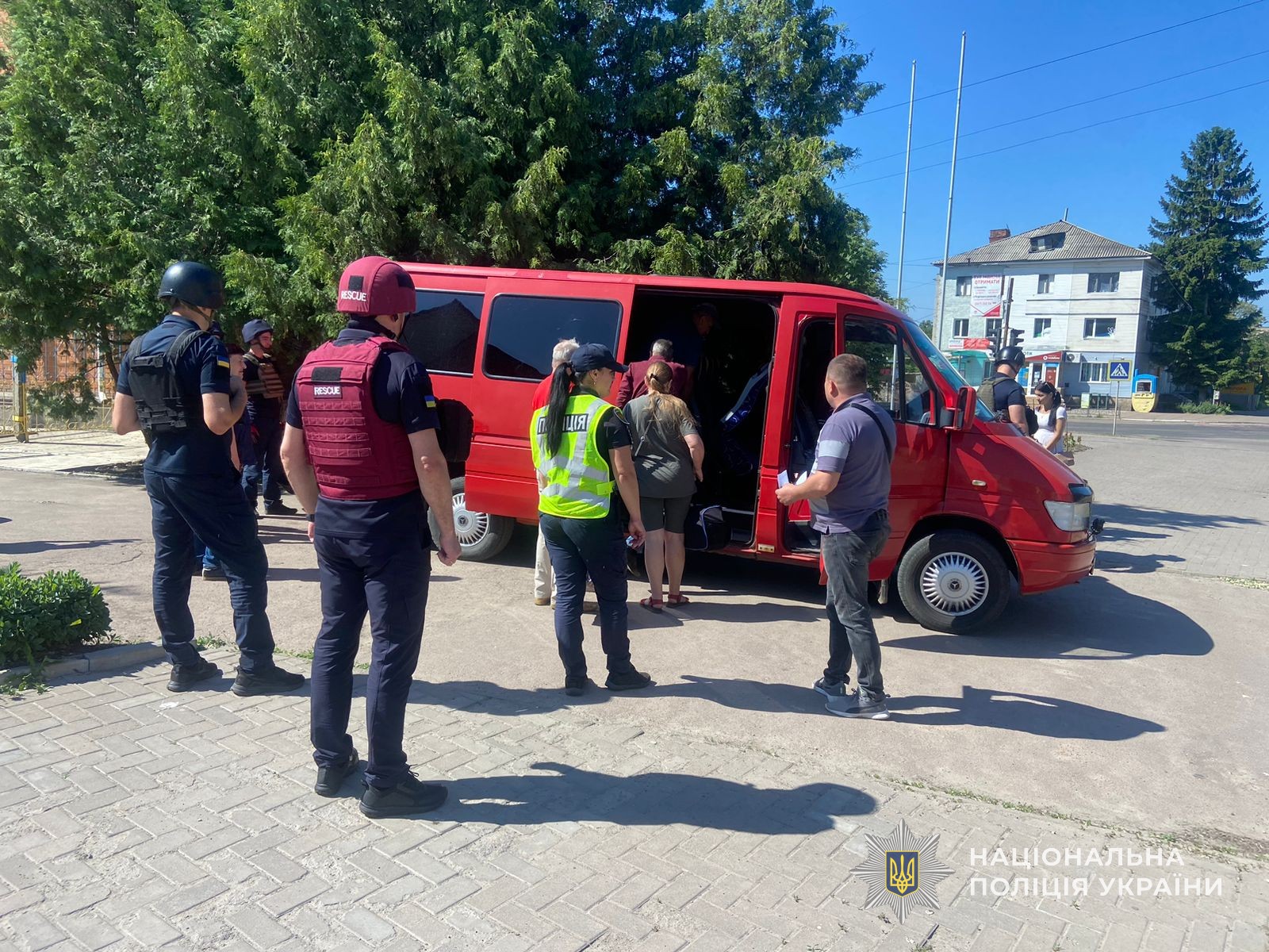 Усіх бажаючих переїхати в більш безпечні місця у супроводі правоохоронців евакуюють автобусами. Тих, у кого немає можливості дістатись до місць збору самостійно, працівники поліції привозять службовим транспортом. Здебільшого це літні люди, жінки та діти.