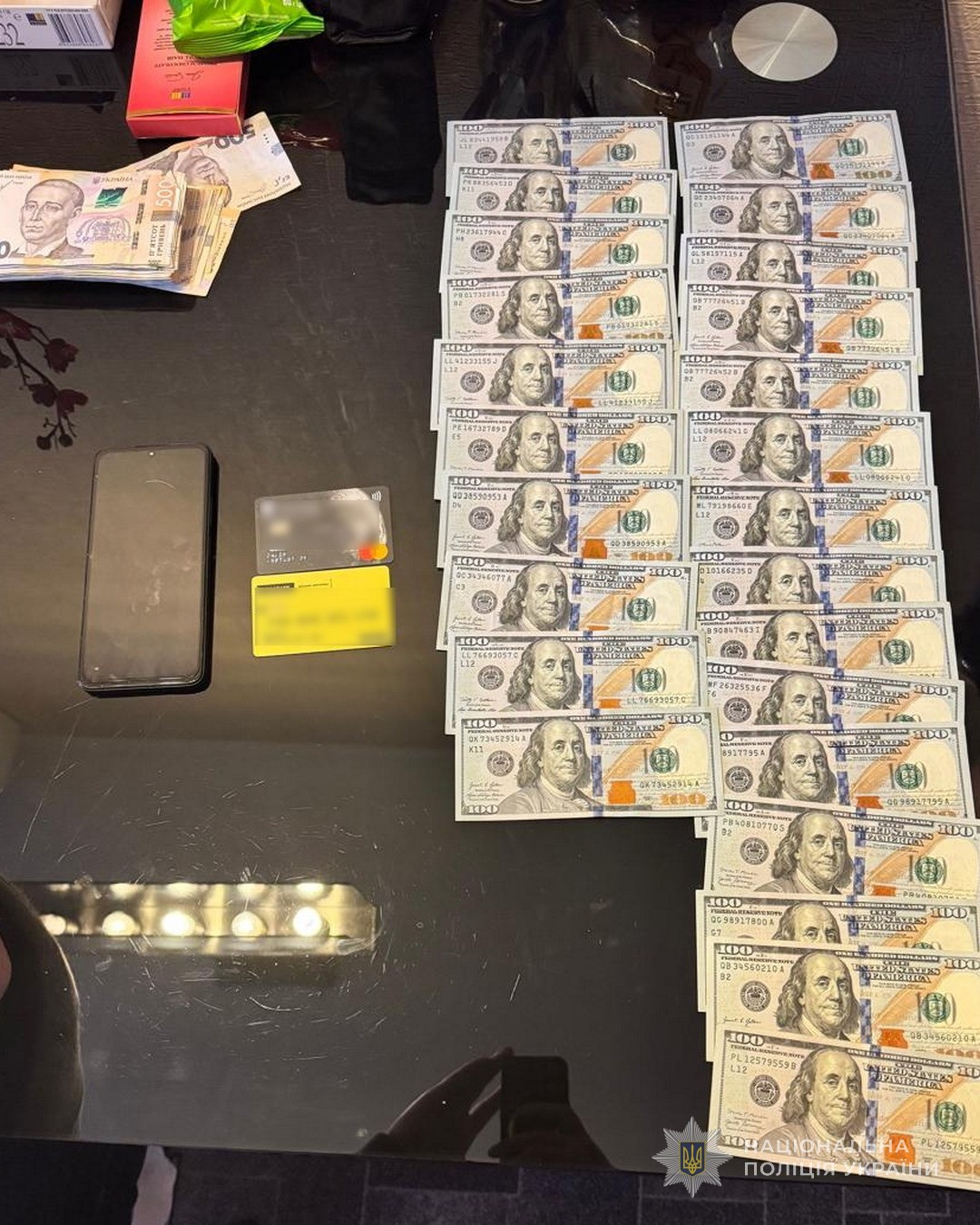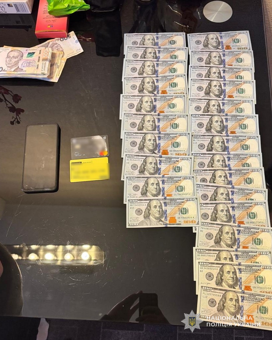 Під час санкціонованих обшуків в Одесі та Сумах правоохоронці вилучили мобільні телефони, банківські картки, чорнові записи, а також значні суми грошових коштів у національній та іноземній валюті.