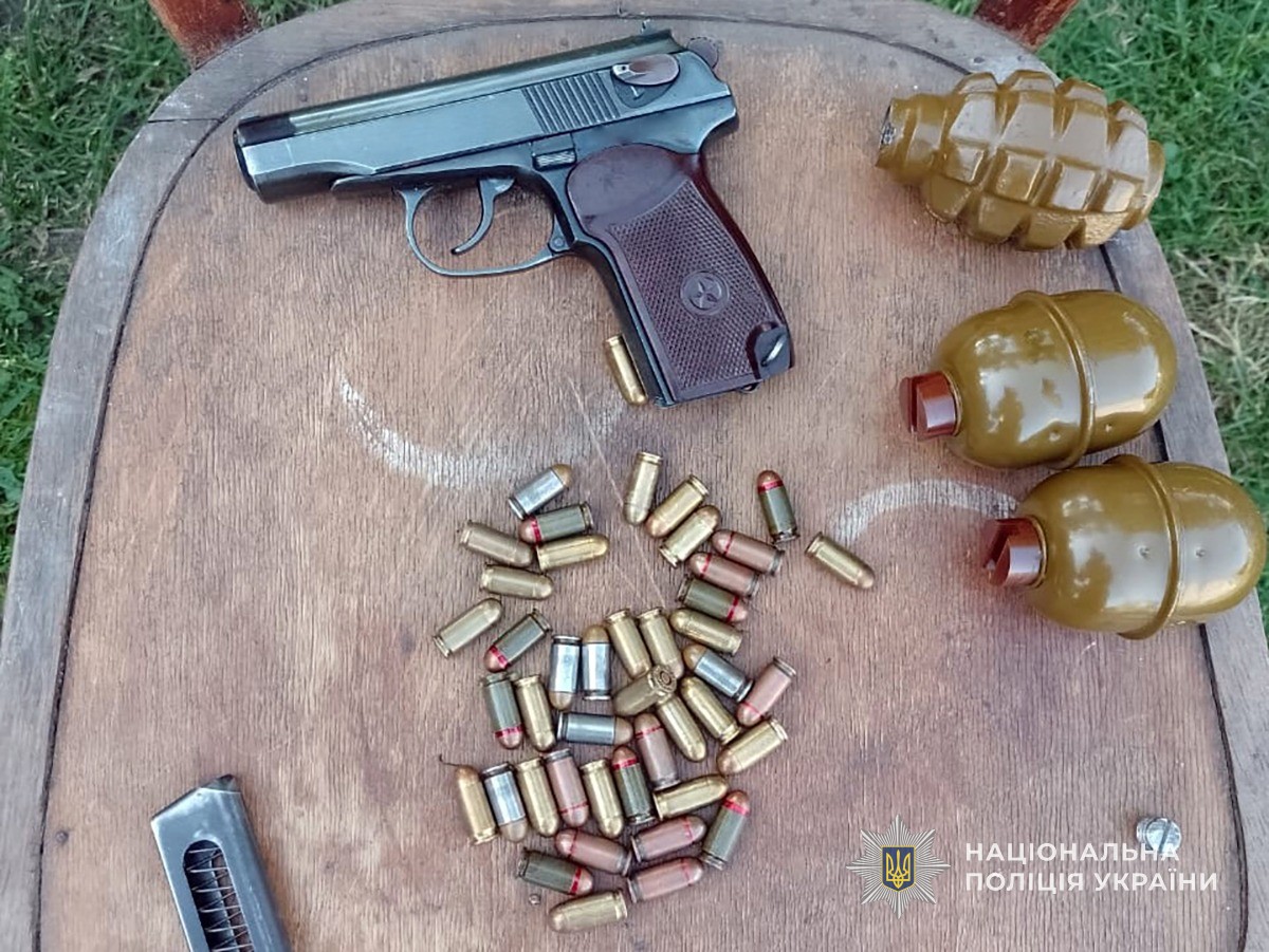 Однак на цьому обшук не завершився. У ході подальшого огляду приміщення правоохоронці виявили також зброю — пістолет, три гранати та набої. Усе виявлене було вилучено, походження зброї встановлюється.