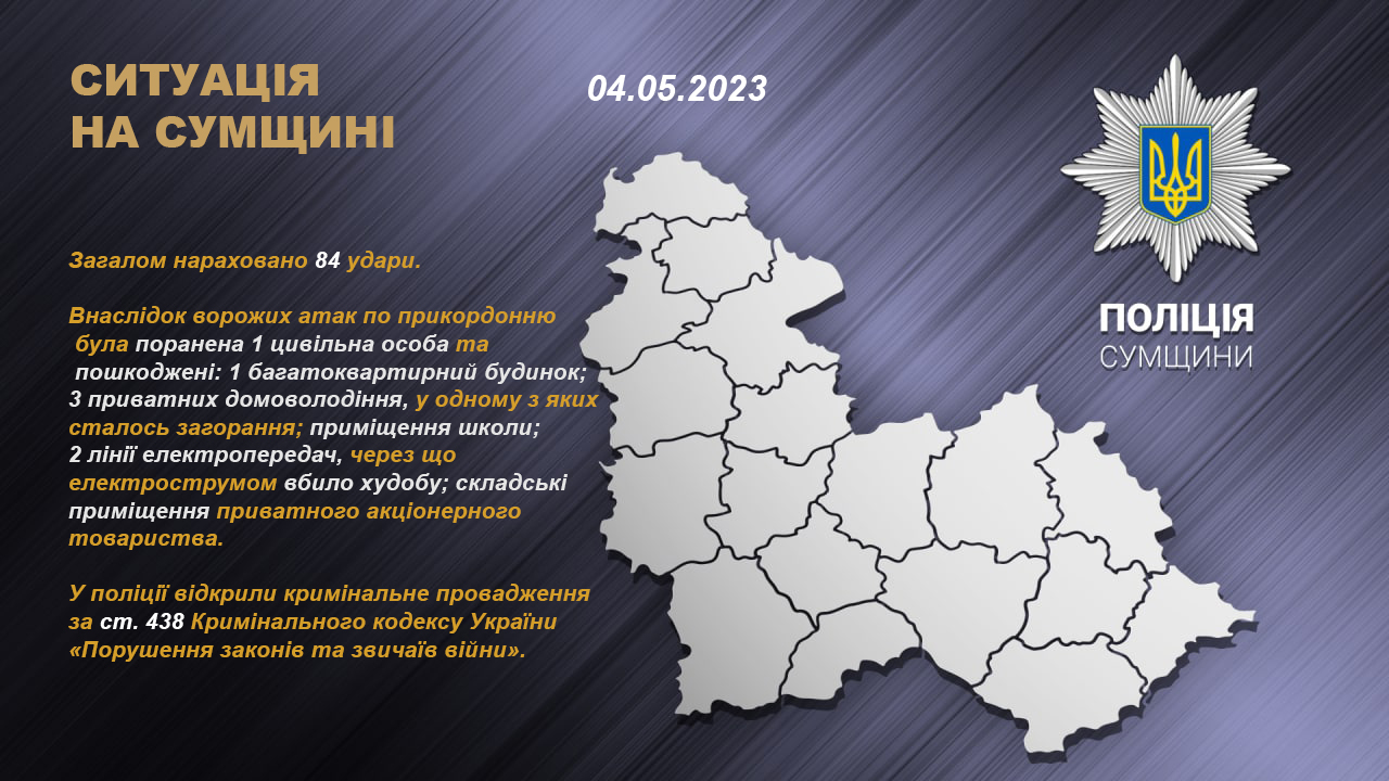 Минулої доби окупанти вкотре обстріляли прикордонні райони Сумської області. Загалом нараховано 84 удари.