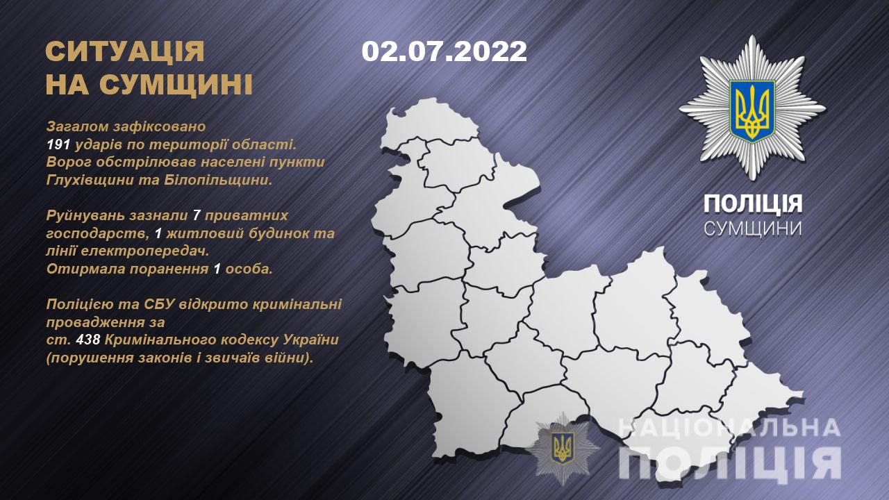 Ворог обстріляв населені пункти Глухівщини та Білопільщини. Загалом зафіксовано 191 ударів, найбільше «прильотів» по Глухівщині.