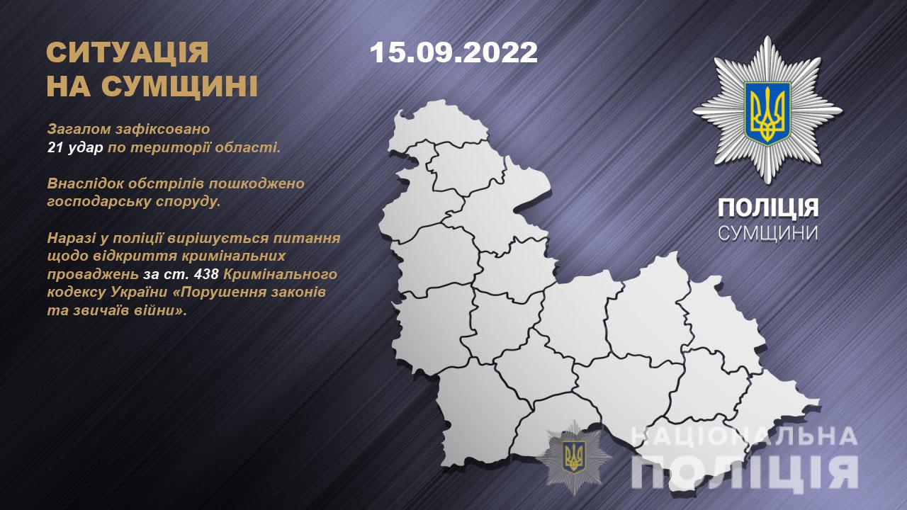 Протягом минулої доби ворог обстріляв населені пункти Сумської області. Загалом нараховано 21 обстріл.