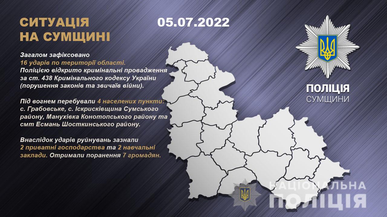 Протягом минулої доби війська рф обстріляли 4 населені пункти області: села Грабовське, Іскрисківщина Сумського району, Манухівка Конотопського району та смт Есмань Шосткинського району.