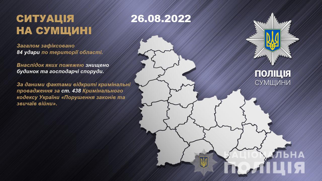 Протягом минулої доби окупанти обстріляли населені пункти Сумської області. Загалом нараховано 84 обстріли. Внаслідок яких пожежею знищено будинок та господарчі споруди.