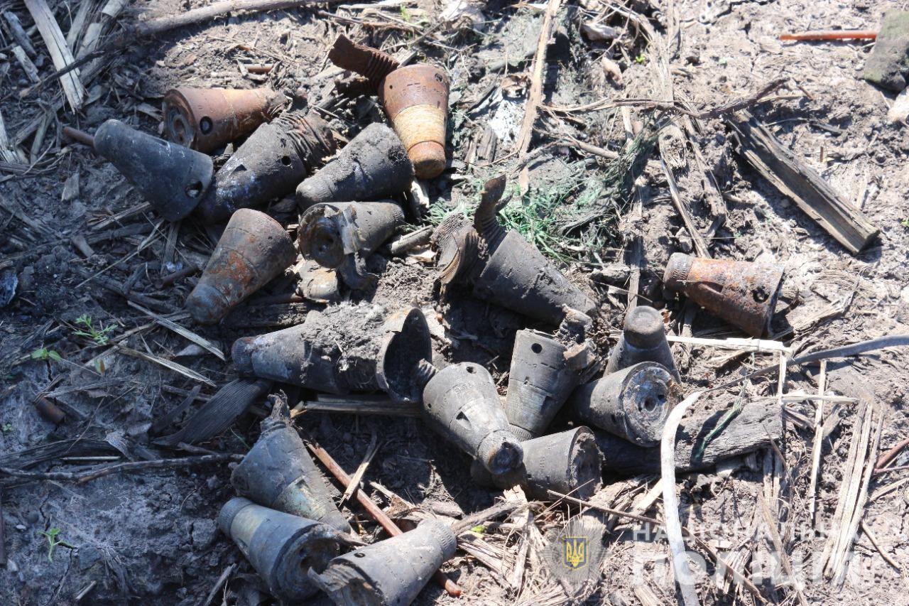 Під час огляду місця події правоохоронці виявили численні металеві уламки від боєприпасу, п’ять патронів та два підривники від снарядів.