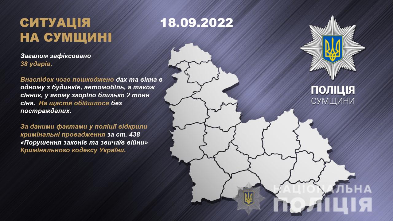 Протягом минулої доби війська рф обстрілювали територію Сумської області. Загалом зафіксовано 38 ударів.
