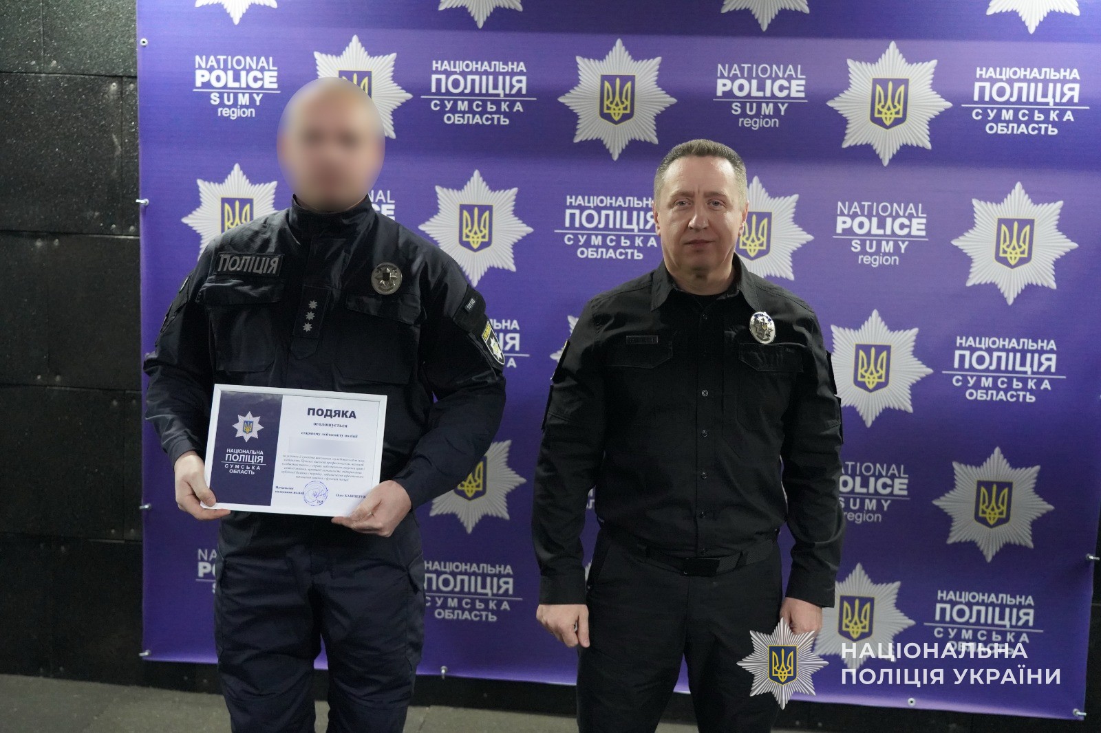 Начальник Головного управління Національної поліції в Сумській області Олег Кашперук вручив нагрудні знаки та подяки працівникам підрозділу за професійність, дисциплінованість та результативність, а також відзначив їхню відповідальність, ініціативність і якісне виконання службових завдань. Окрім того, наказом Національної поліції поліцейським у порядку заохочення вручили спеціальні звання.