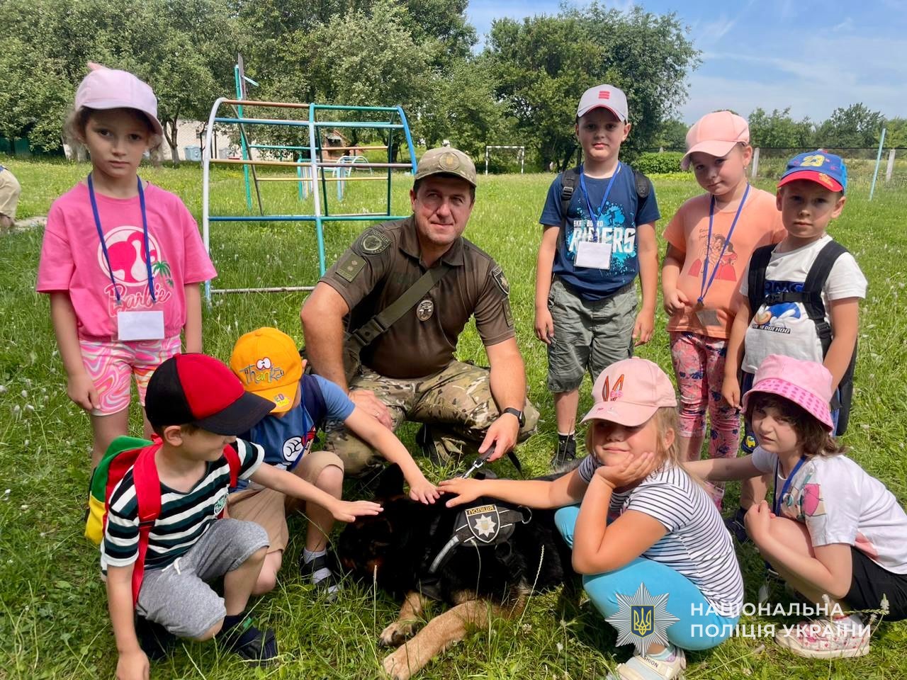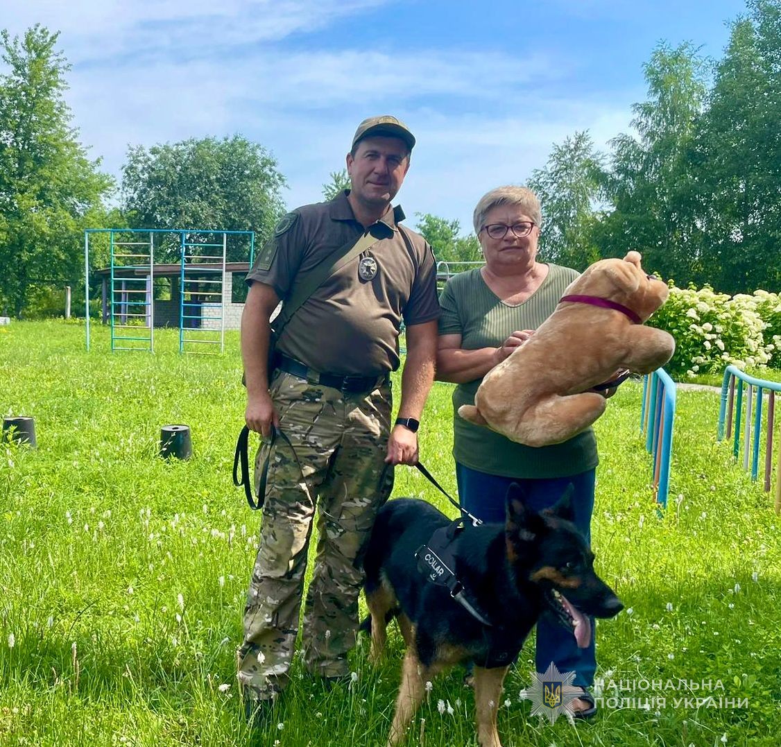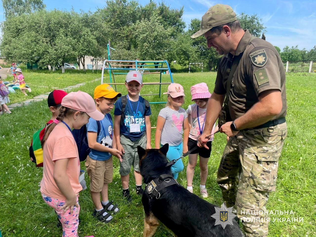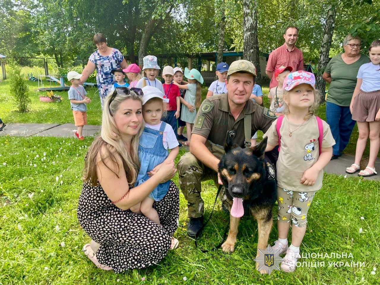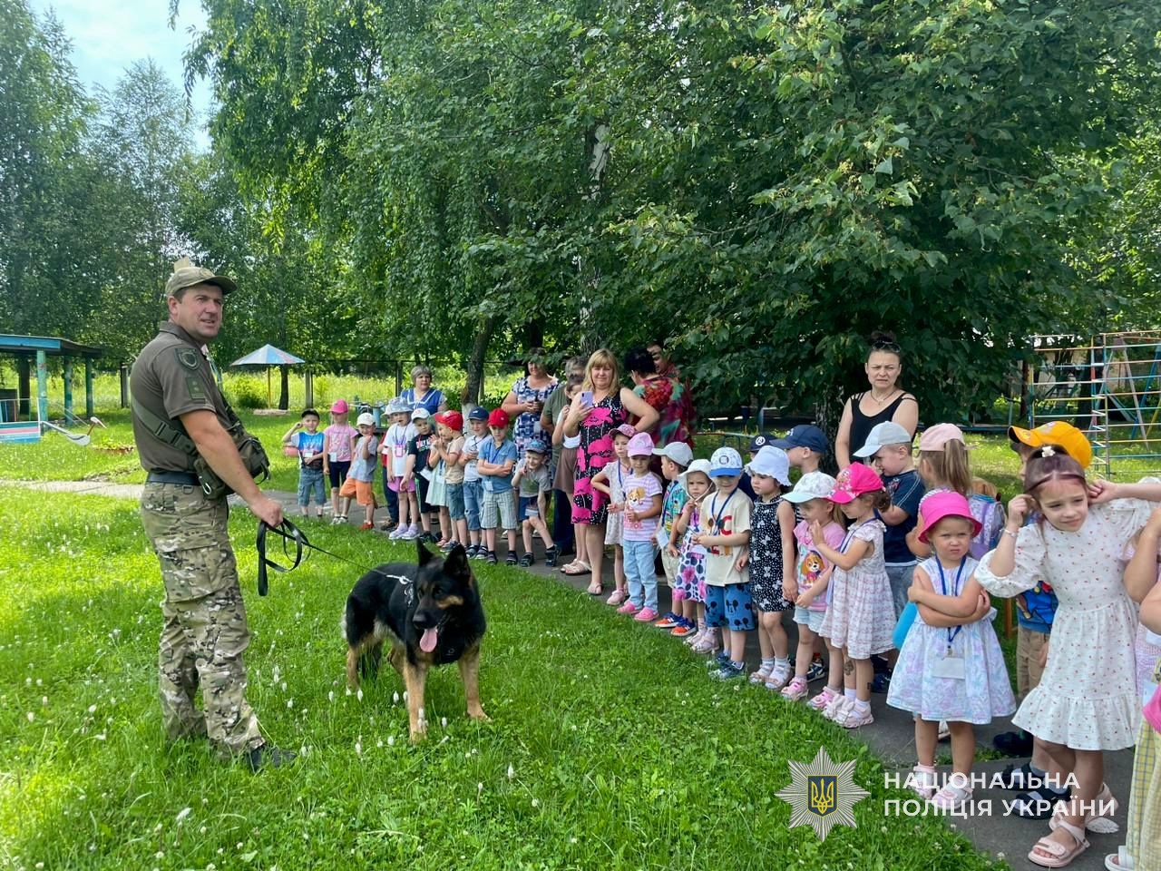 На початку заходу інспектор розповів малечі у яких випадках застосовуються службові собаки та як за своїми вміннями поділяються чотирилапі. Собака Панда з якою поліцейський-кінолог завітав до дітей є пошуковою собакою. Вона спеціалізується на відшукуванню людей чи речей за запахом.
