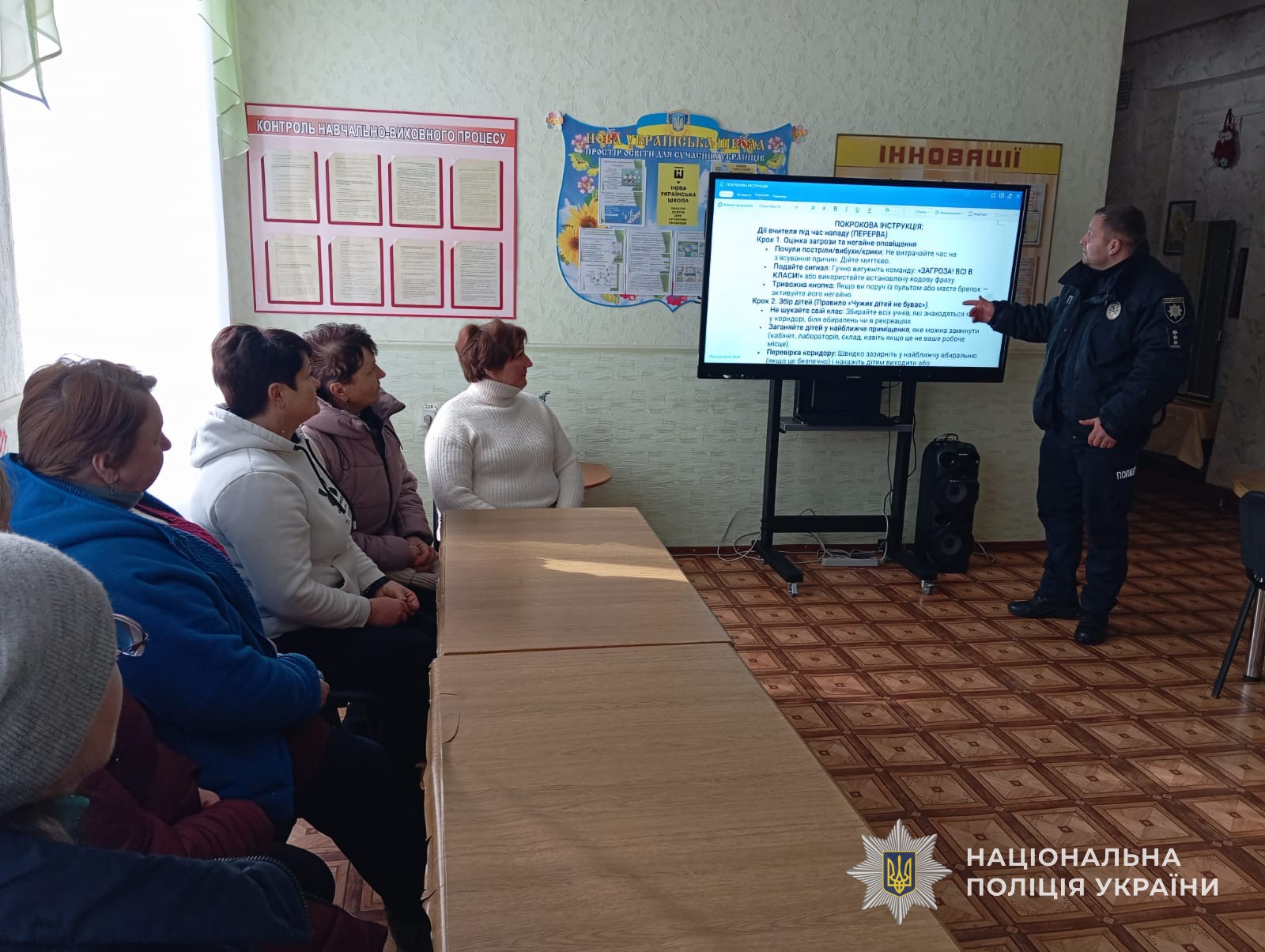 В одному із закладів освіти відбулася зустріч з педагогічним колективом, під час якої обговорили алгоритми дій у разі повітряної тривоги, виявлення підозрілих предметів, можливого нападу на заклад освіти чи інших загроз. В іншому навчальному закладі подібний захід провели для учнів, яким також роз’яснили порядок дій у вищевказаних ситуаціях.