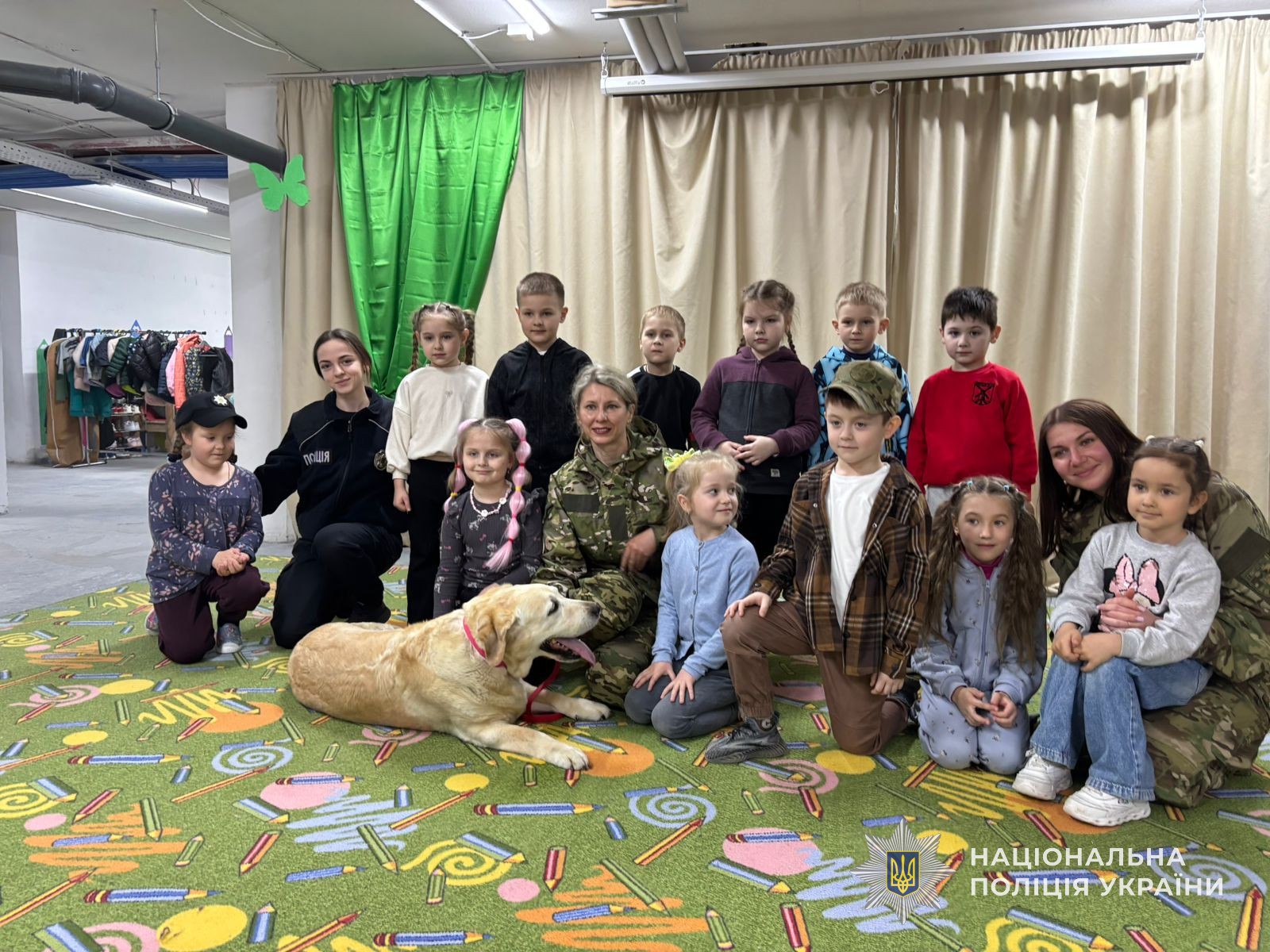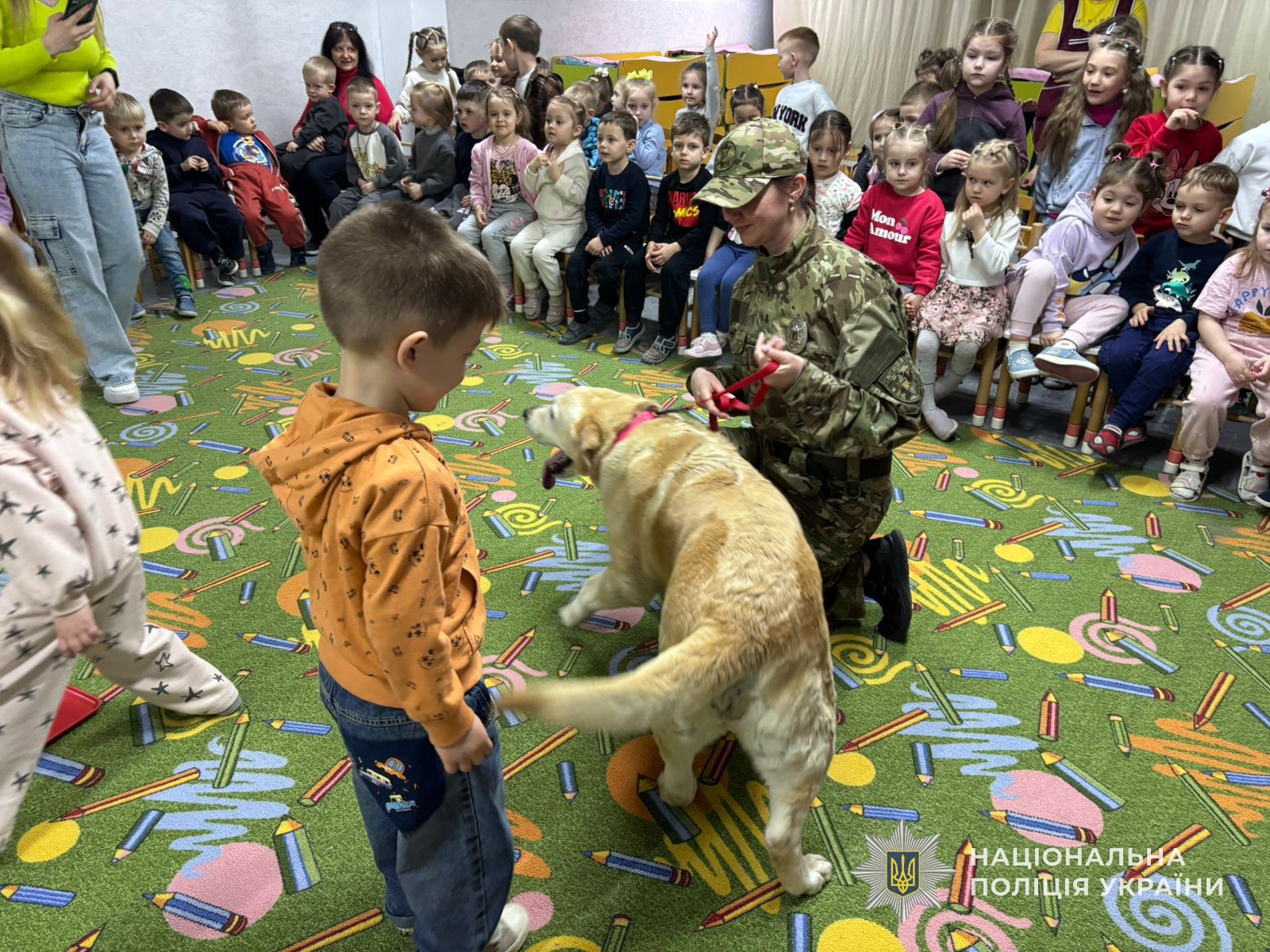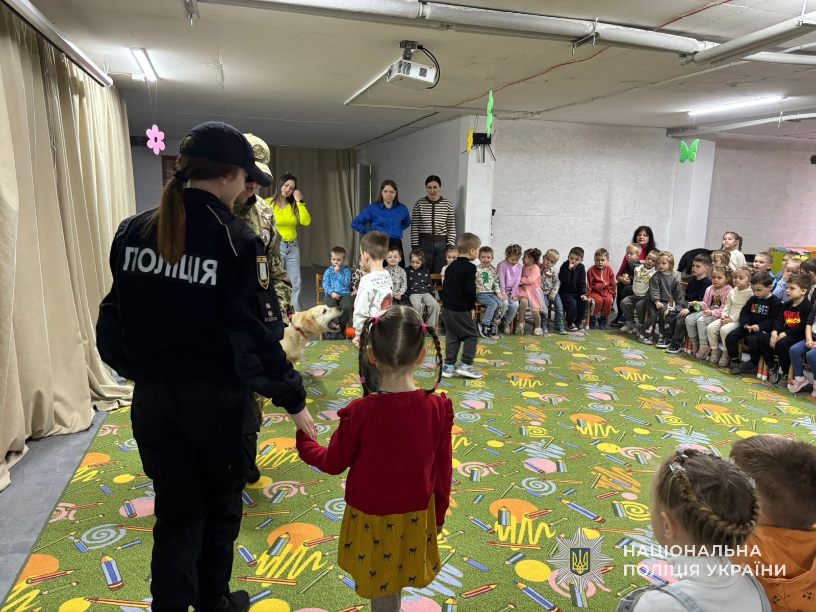 Разом із правоохоронцями до малечі прийшов особливий гість — собака емоційної підтримки. Саме він став головним помічником під час заняття, яке провели поліцейські для дітей.