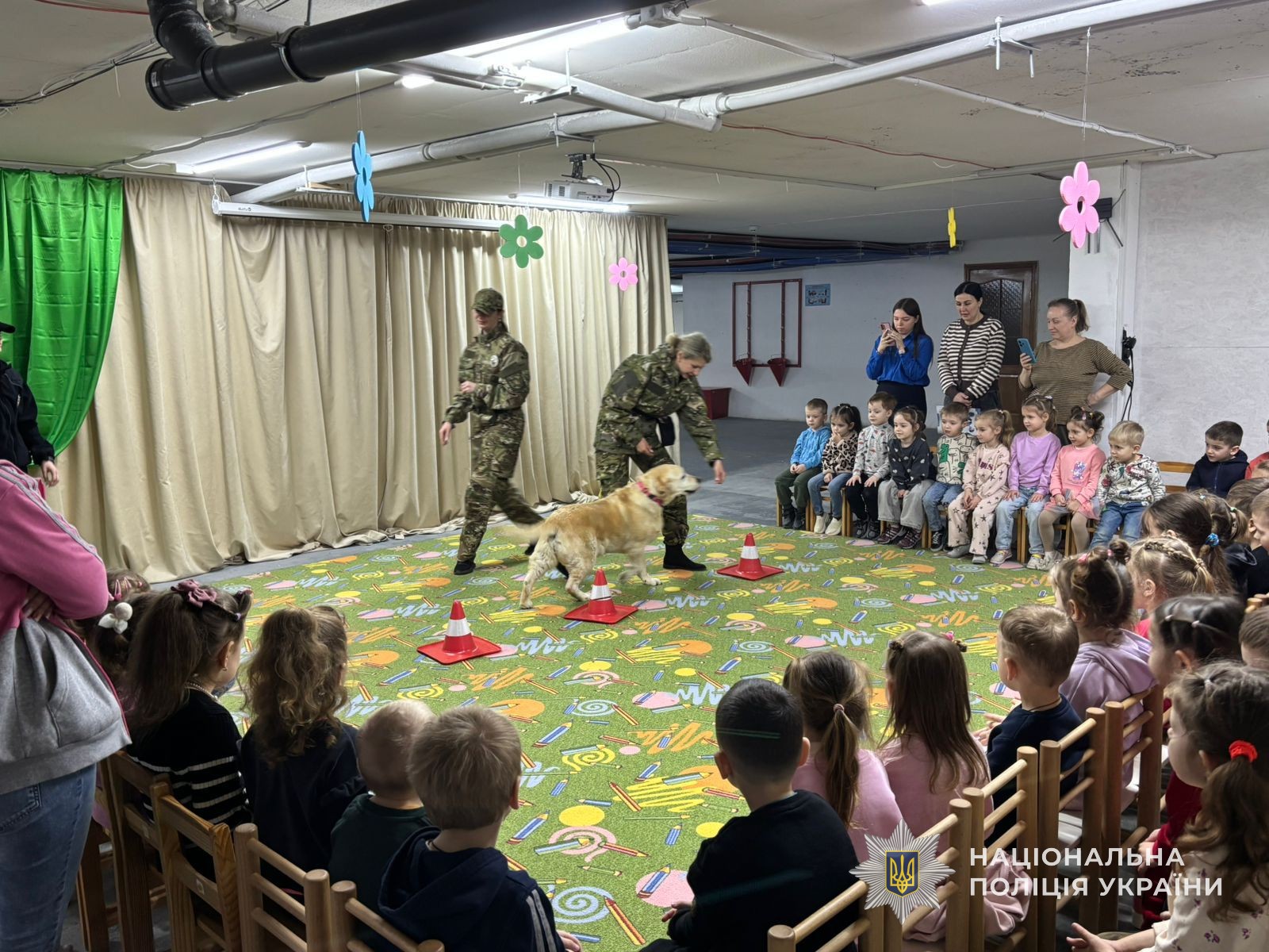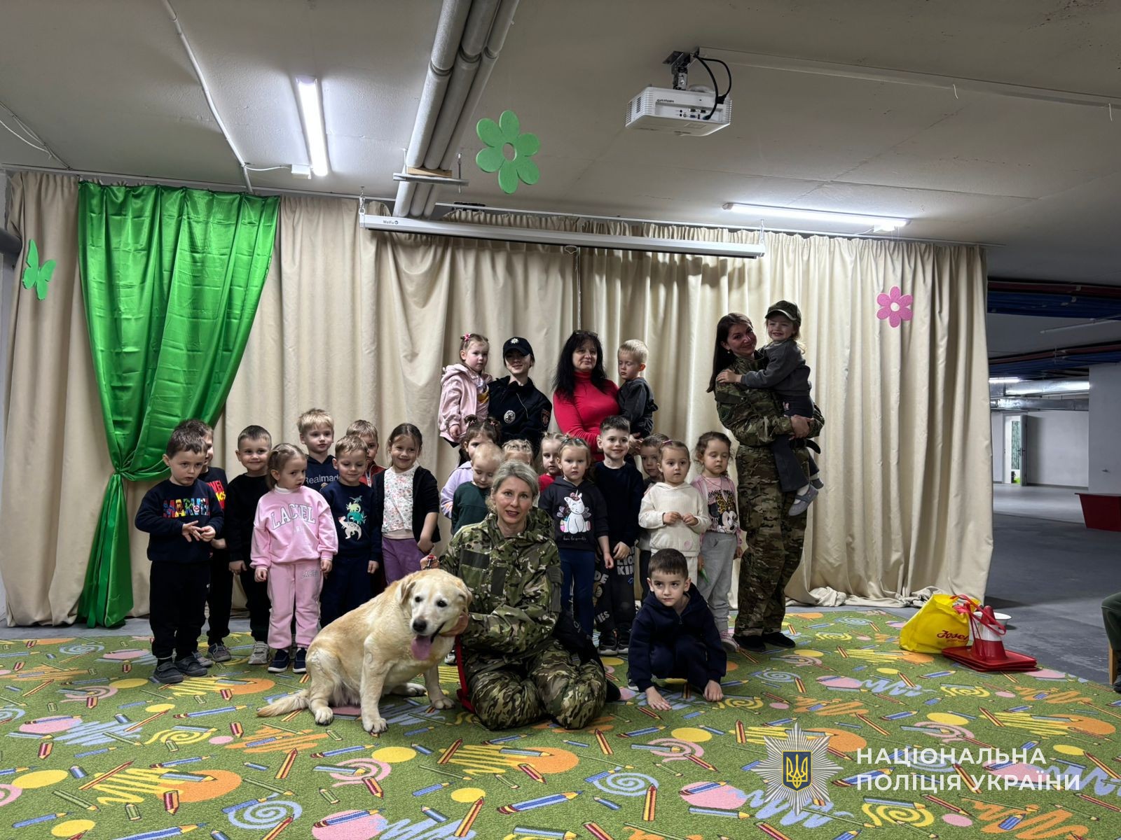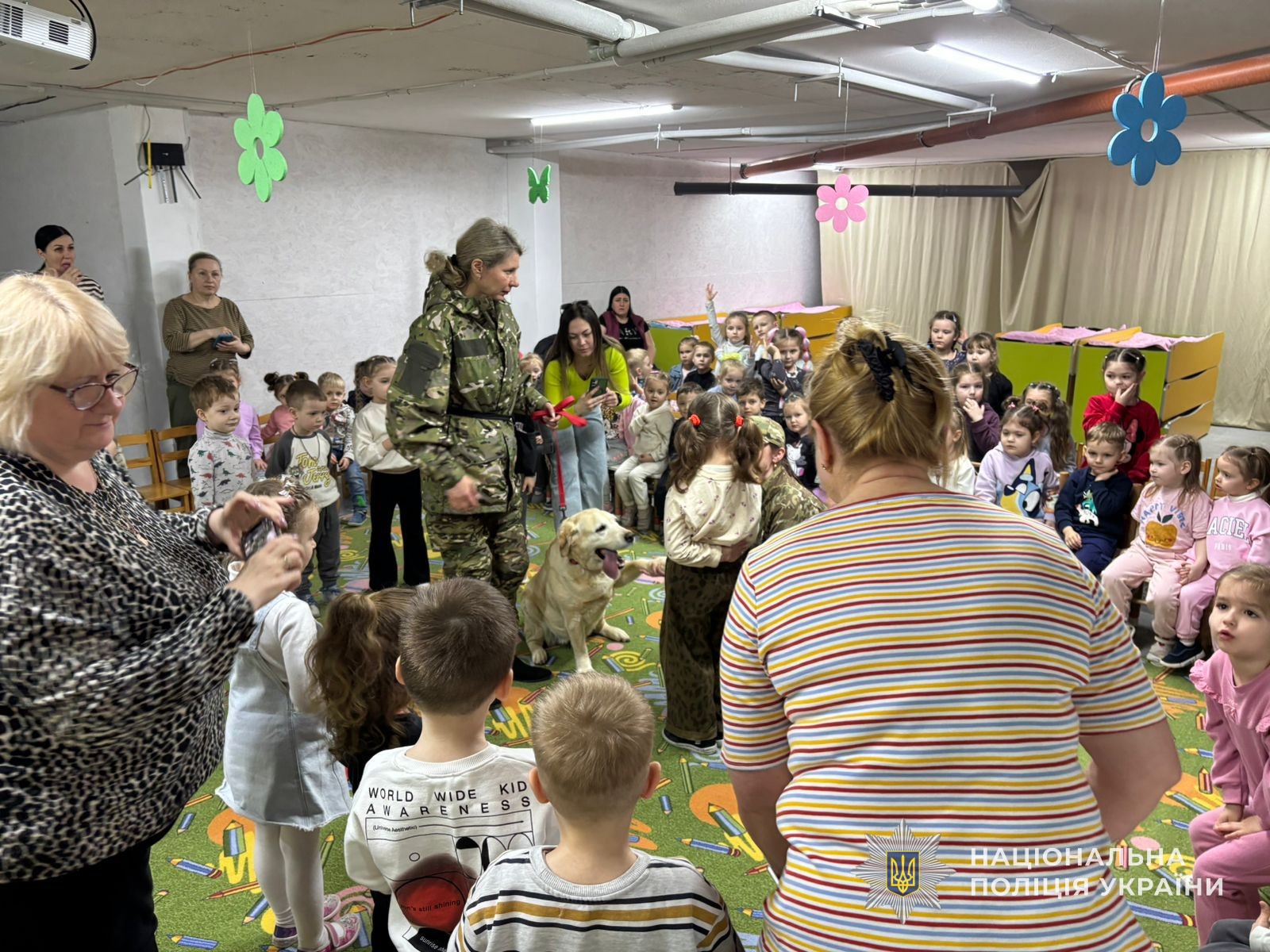 Разом із правоохоронцями до малечі прийшов особливий гість — собака емоційної підтримки. Саме він став головним помічником під час заняття, яке провели поліцейські для дітей.