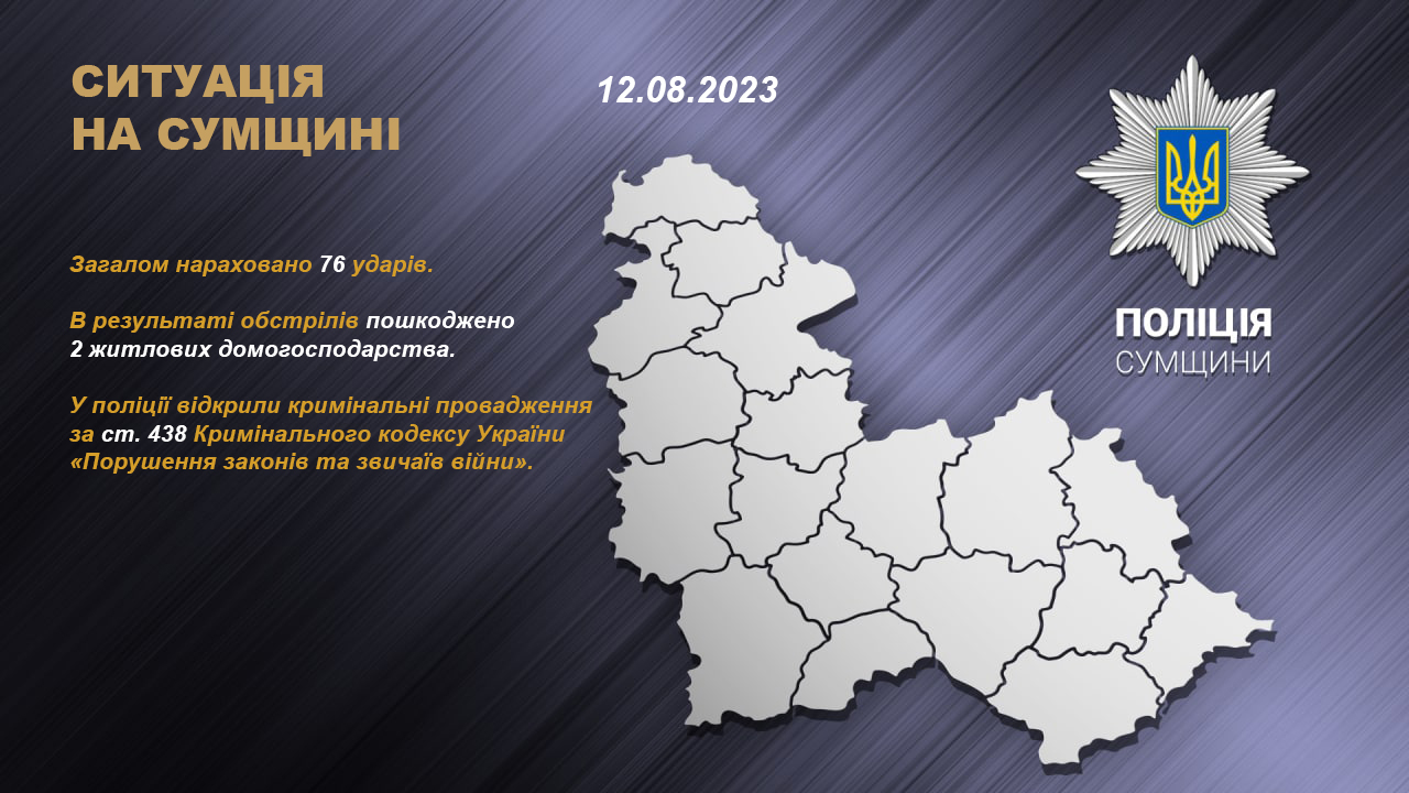 Упродовж минулої доби російські війська 12 разів обстрілювали територію області. Атакували артилерією, мінометами та дронами. Загалом зафіксовано 76 ударів.