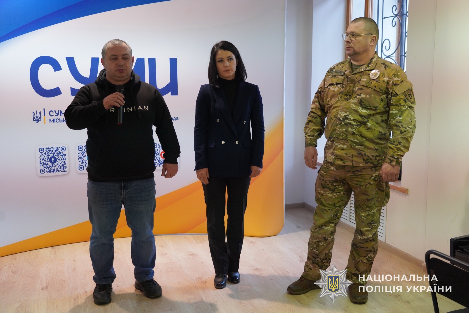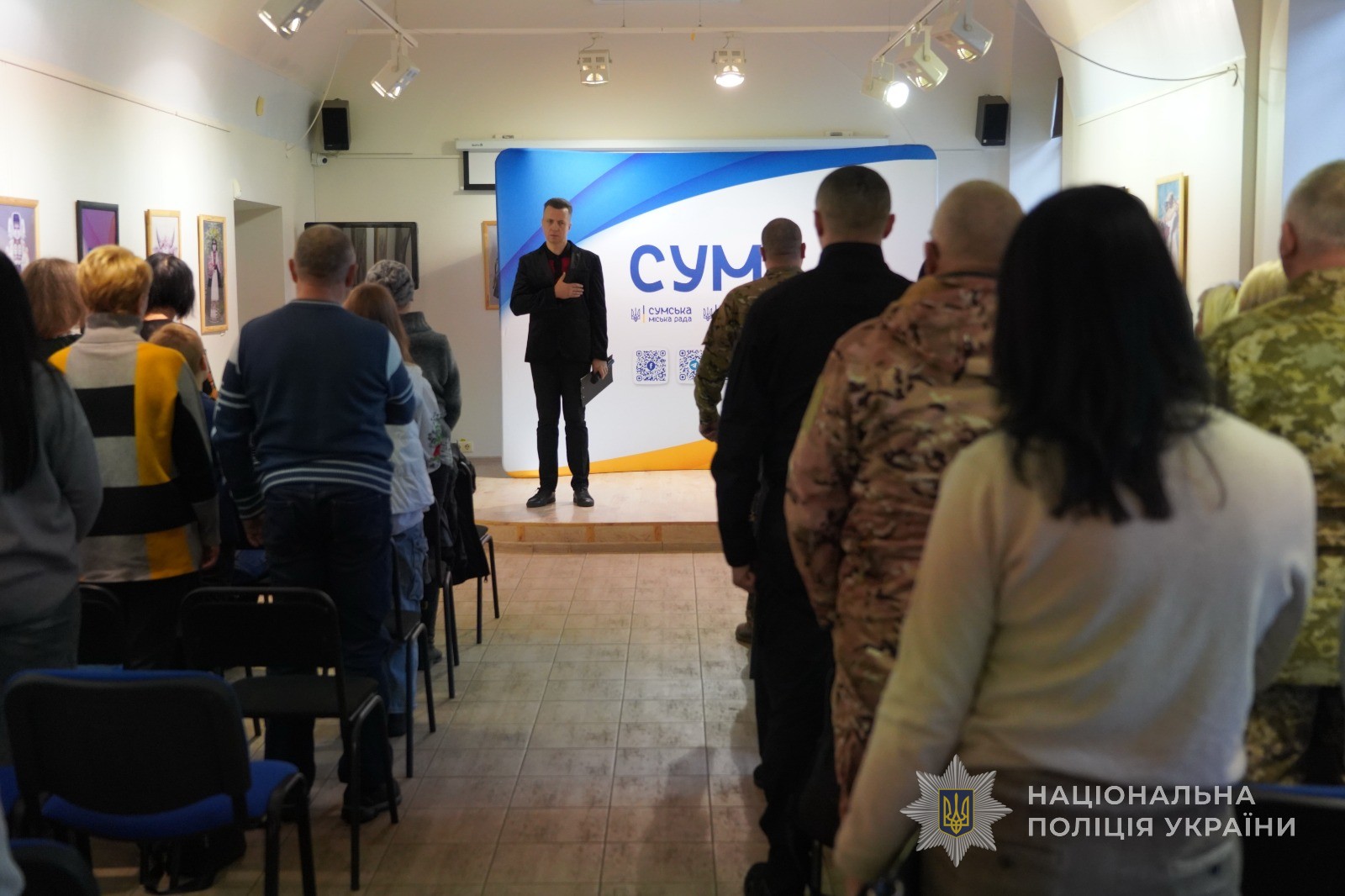 Захід розпочався хвилиною мовчання, під час якої присутні схилили голови в пам’ять про полеглих захисників. До заходу долучились колеги загиблих поліцейських, серед яких і заступник начальника ГУНП в Сумській області Олексій Берещук. Посвідчення рідним загиблих правоохоронців вручили виконуючий обов’язки міського голови Артем Кобзар, його заступник Римма Бикова, помічник начальника Департаменту поліції особливого призначення «Об’єднана штурмова бригада Національної поліції «Лють» В’ячеслав Вусінський.