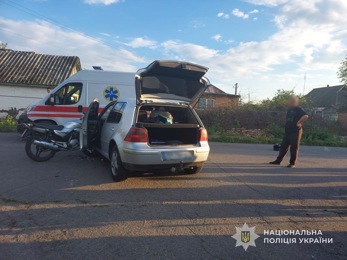 За попередніми даними, 23-річний водій автомобіля «Volkswagen Golf» не надав перевагу у русі мотоциклу, яким керував 18-річний молодик та знаходилася 16-річна пасажирка. Внаслідок дорожньо-транспортної пригоди дівчина та водій двоколісного транспортного засобу отримали тілесні ушкодження. Потерпілих ушпиталили до лікарні для обстеження та надання допомоги.
