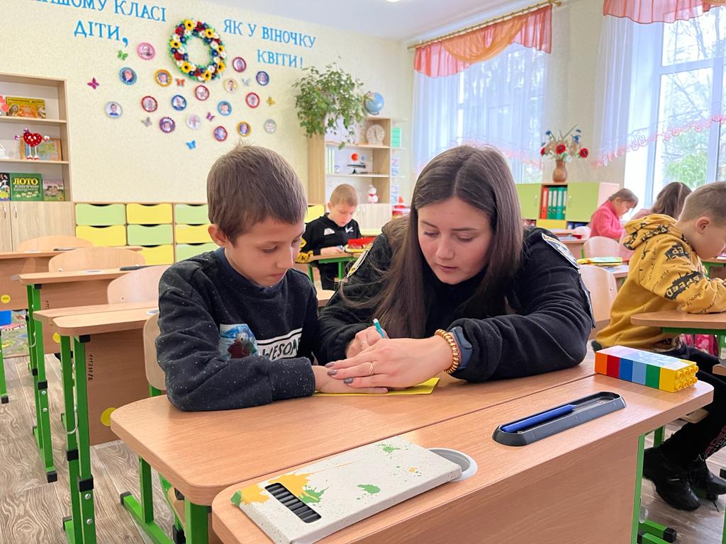 По завершенню зустрічі діти разом з поліцейськими вирізали «долоньки добра» та закріпили їх на шкільній дошці у формі уявних променів сонця з вірою мирне майбутнє.