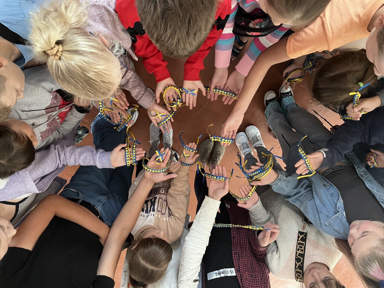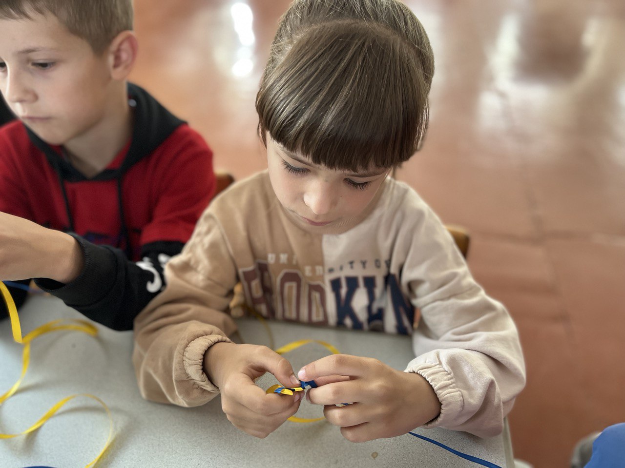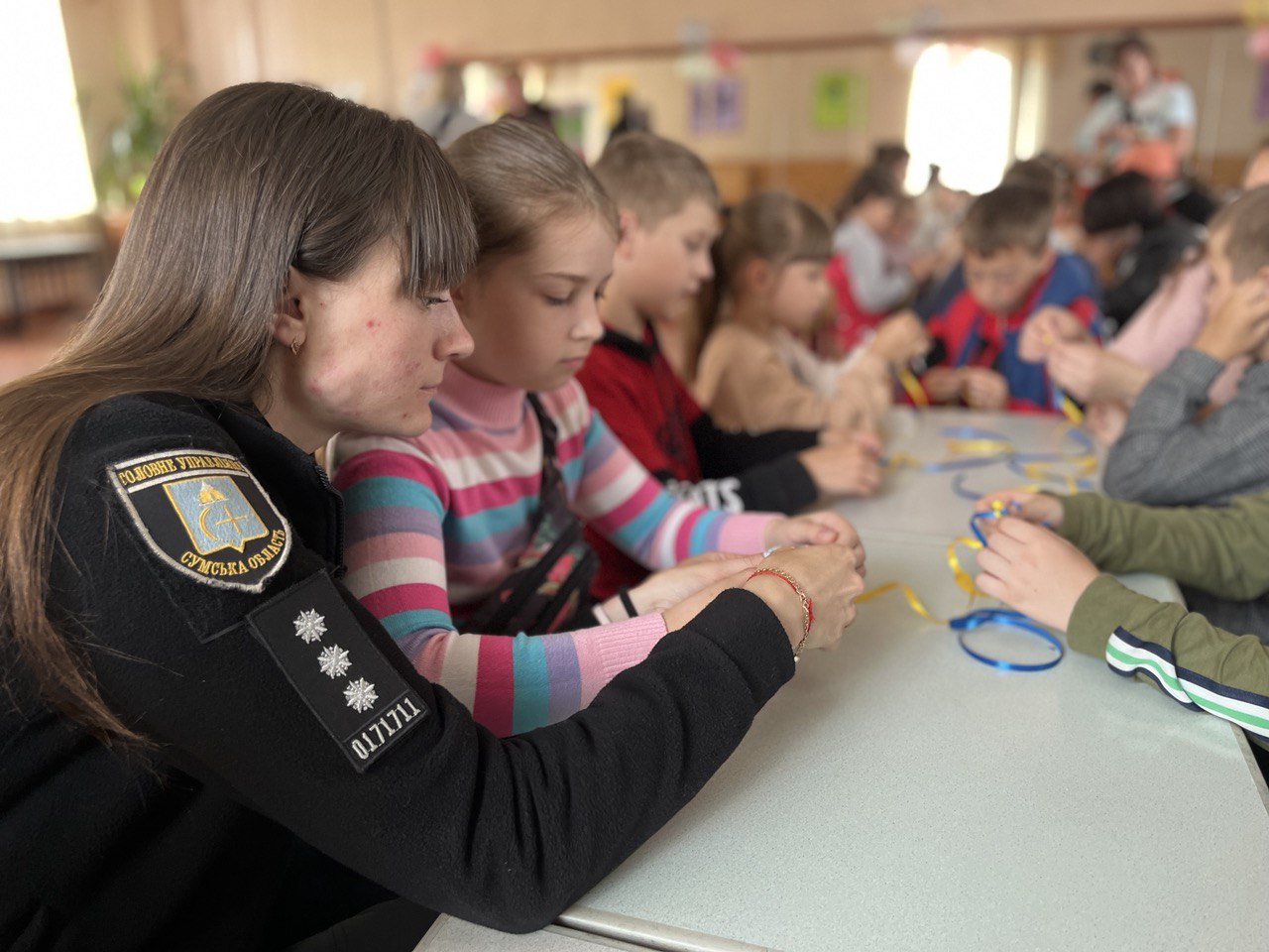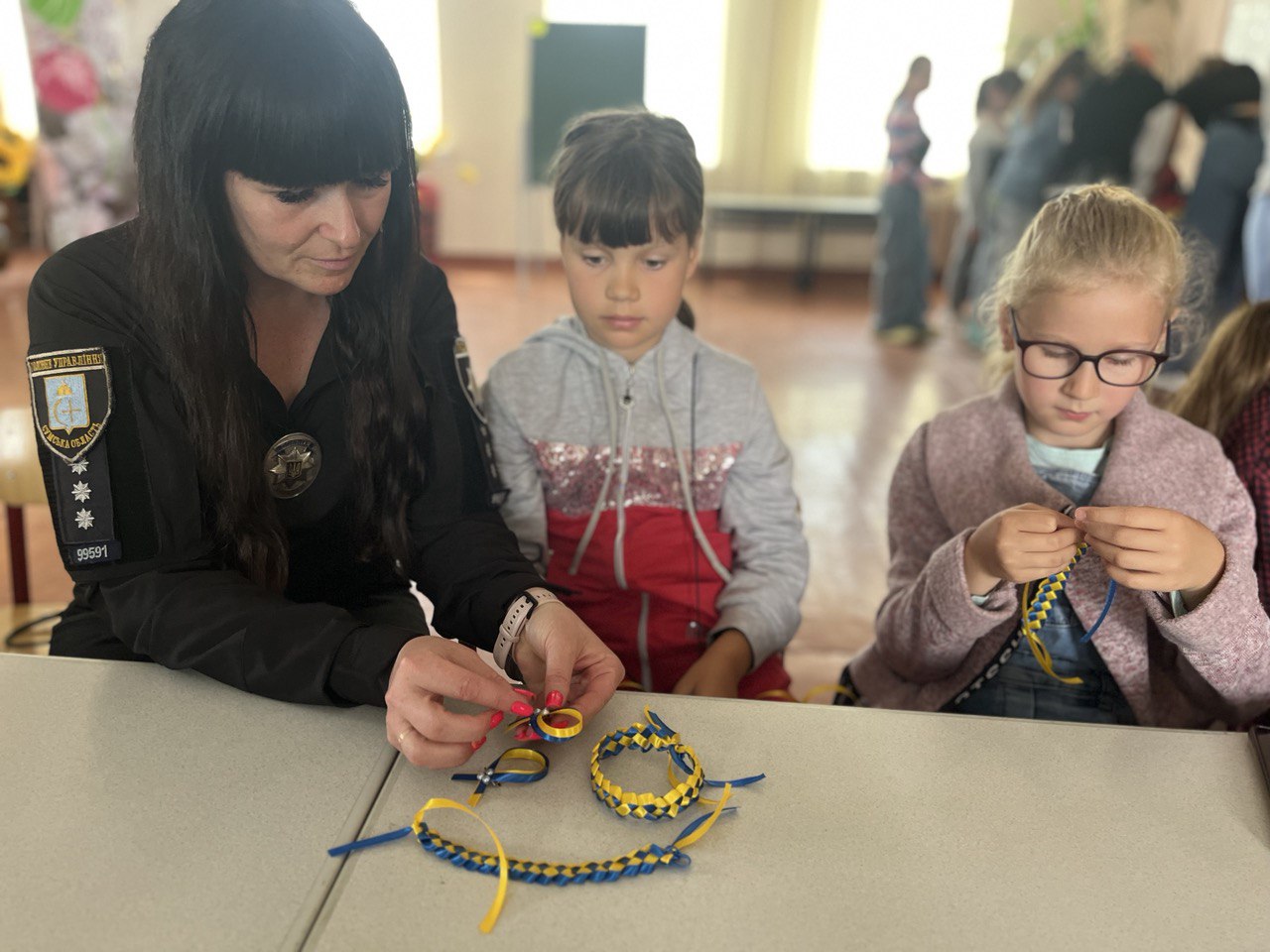 Діти виготовляли плетені браслети з жовто-блакитних стрічок, а правоохоронці розповідали їм про історію нашого краю, духовні цінності українського народу, обряди та звичаї наших предків. Потім, як всі виробити були готові, поліцейські спільно з дітьми провели благодійний ярмарок на підтримку захисників України. А все заради того, аби в цей не легкий час підняти їхній бойовий дух.