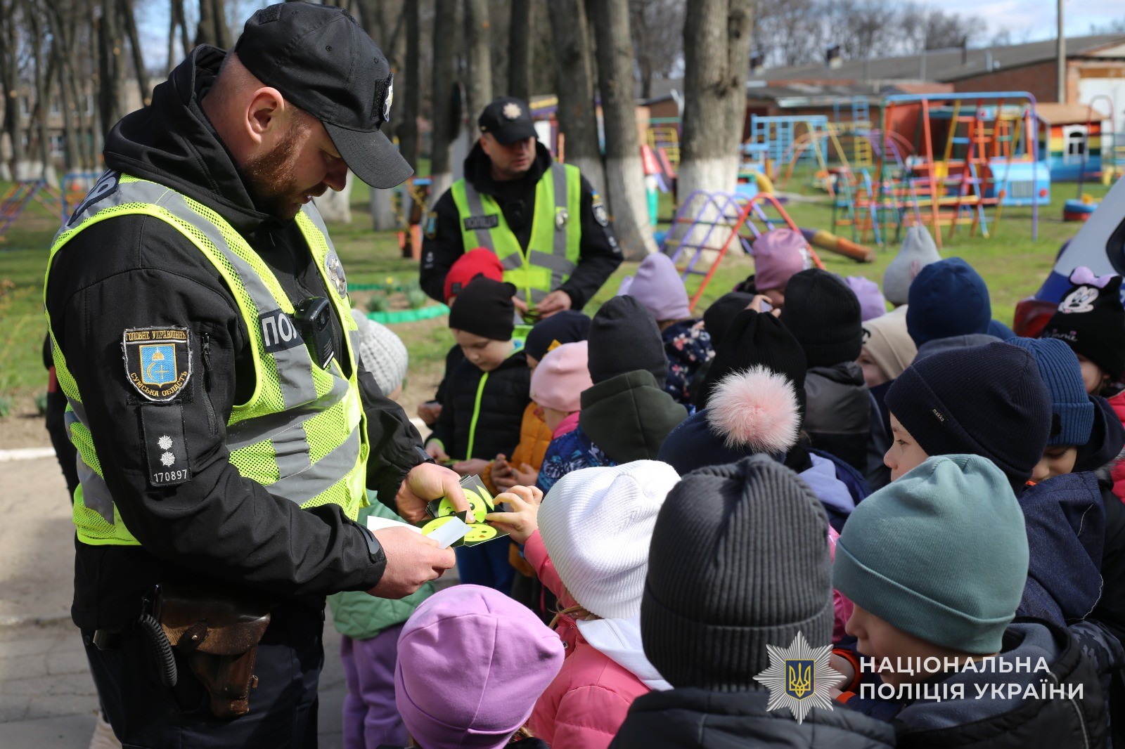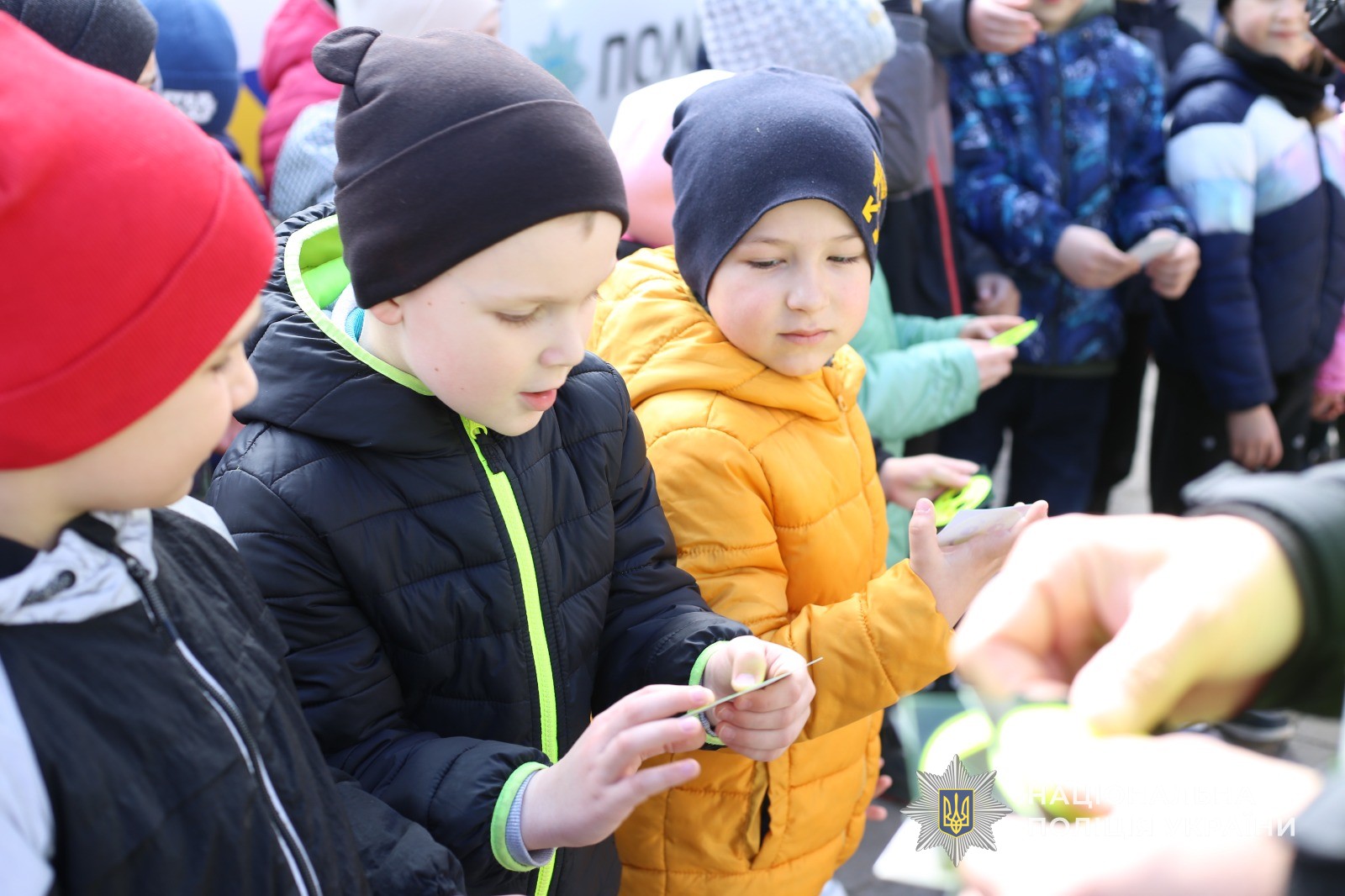 Зокрема під час виступу співробітники поліції пояснили юним слухачам чому саме в темну пору доби пішоходи повинні мати на одязі світловідбиваючи елементи, які вони відразу подарували дітям.