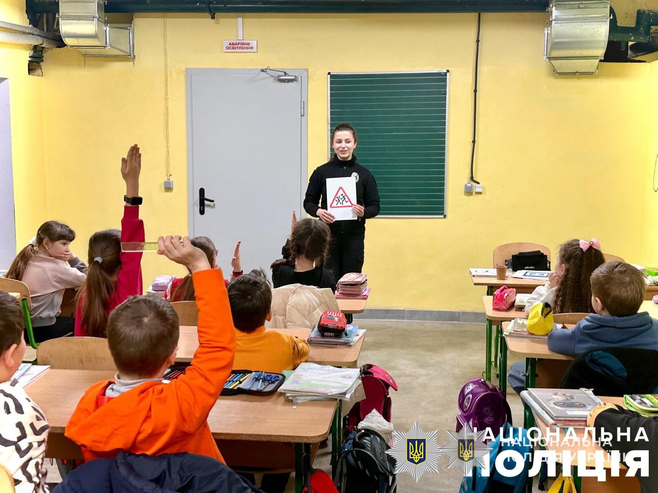 У навчальних закладах з учнями молодших класів правоохоронці докладно знайомлять дітей з темою «Безпека дорожнього руху для маленьких пішоходів».