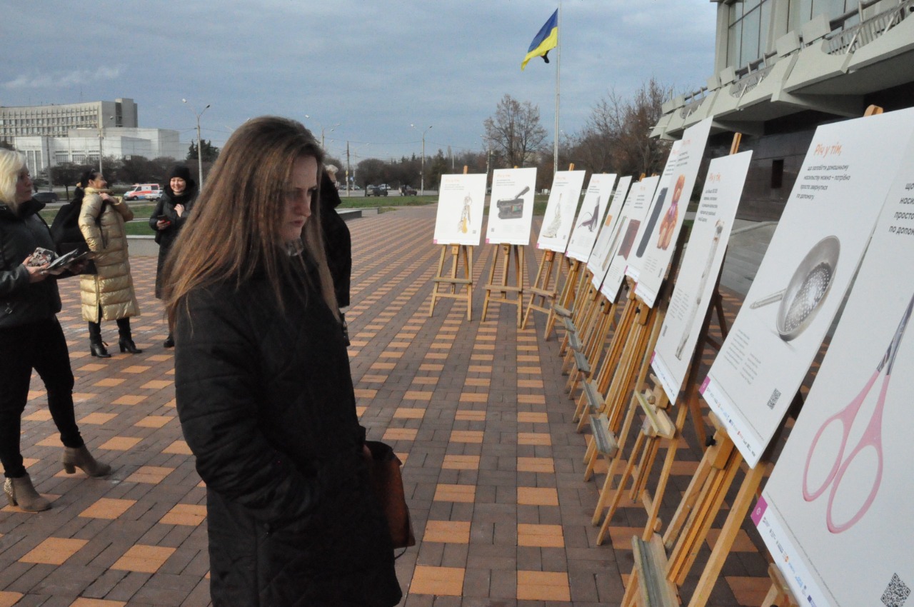 На виставці були розміщені світлини де представлені відео з трагічними історіями, які розповідають про випадки домашнього насильства.