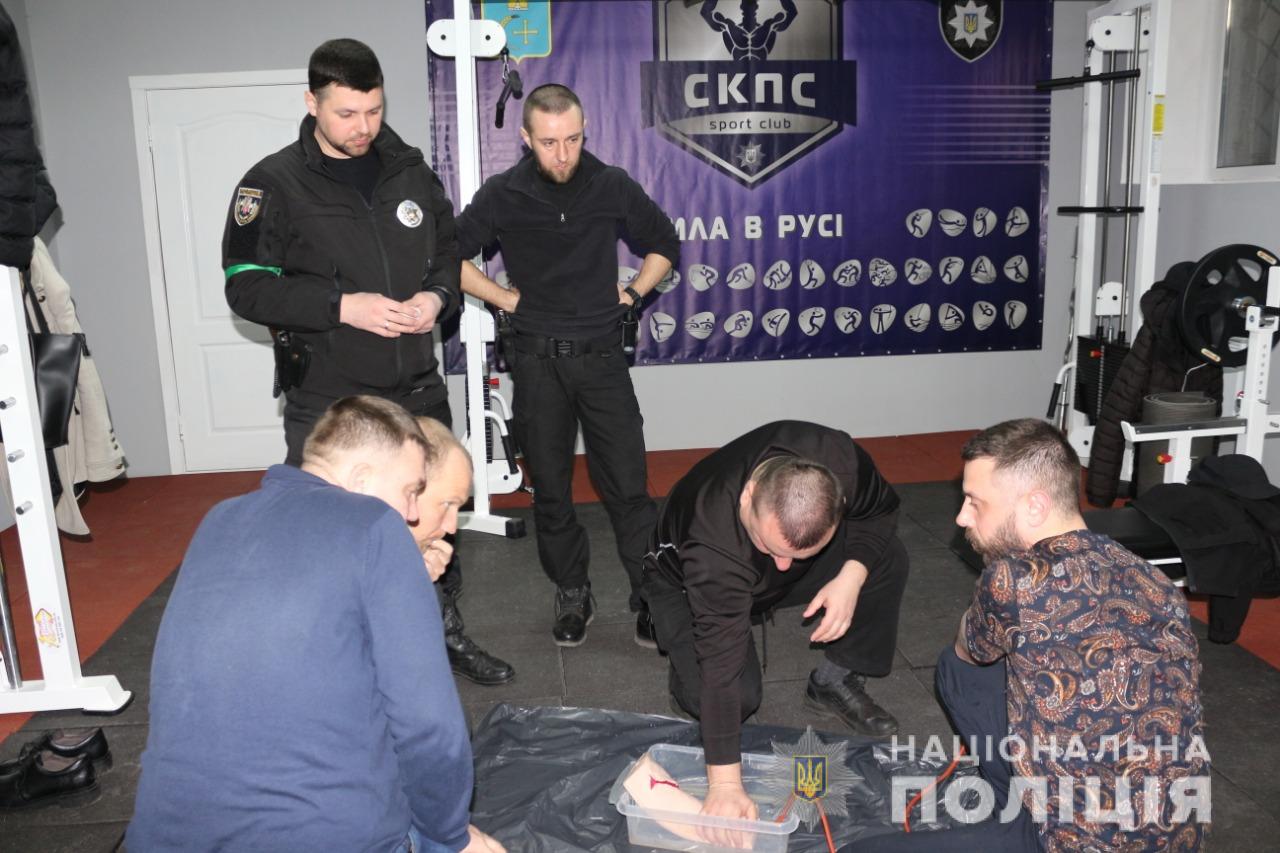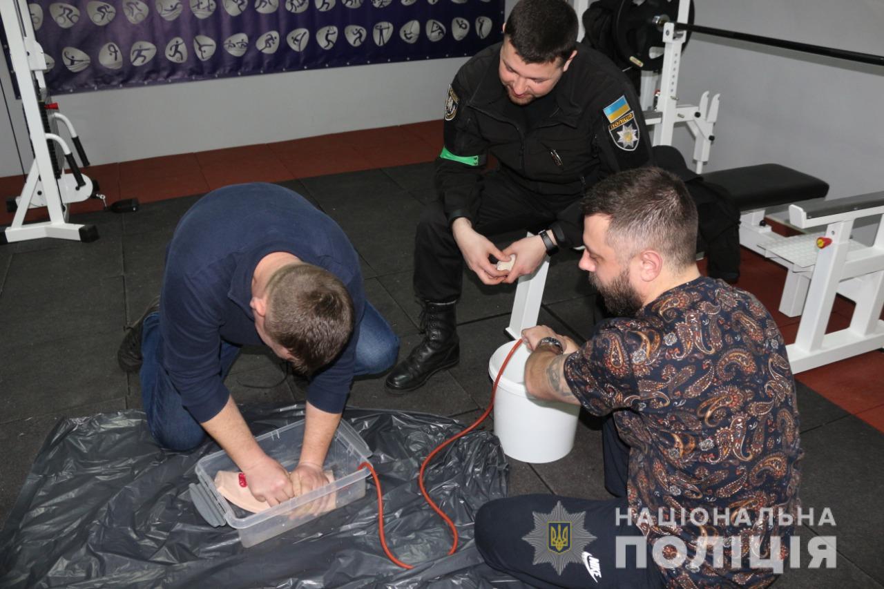 Поліцейські на спеціальних манекенах тампонували кульову та рвані рани, відпрацювали накладення турнікету та тиснучої пов’язки. Медики показали як правильно вводити повітроводи для відновлення та полегшення дихання.