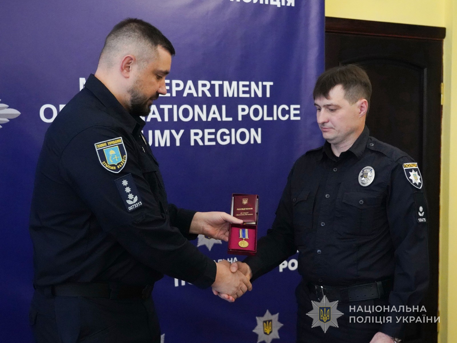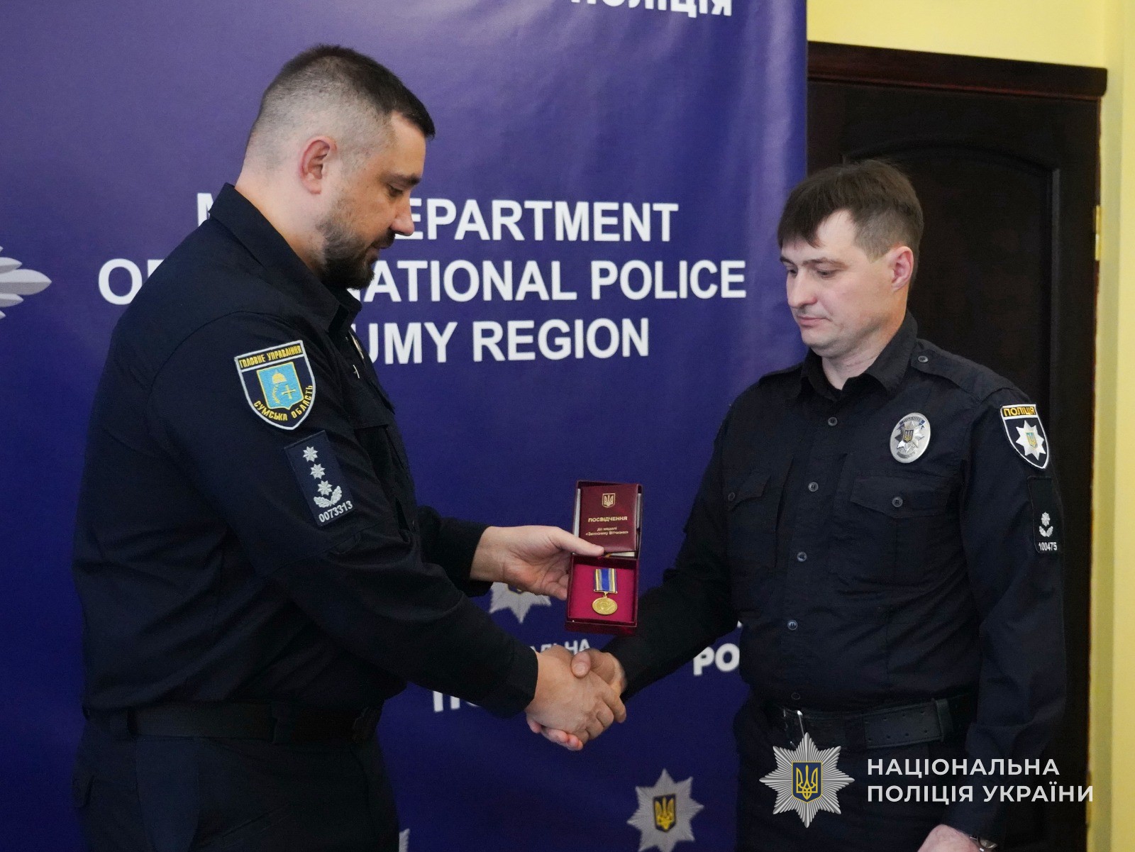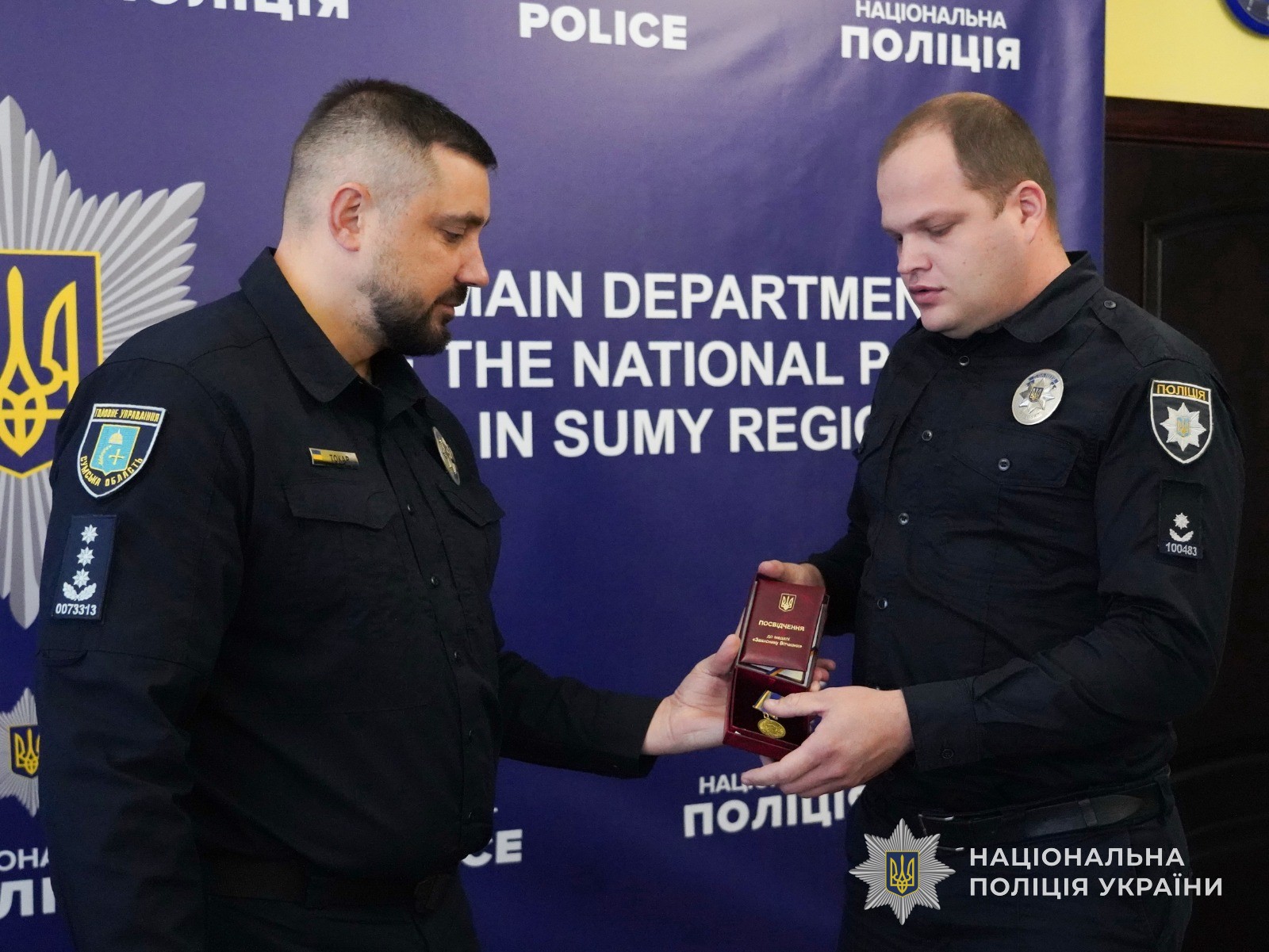 На початку наради, Указом Президента України, за особисту мужність і самовіддані дії, виявлені в захисті державного суверенітету та територіальної цілісності України, здійснення заходів із забезпечення національної безпеки й оборони, відсічі і стримуванні збройної агресії рф, за вірність Присязі, начальник поліції області вручив державні нагороди кращим працівникам відділення поліції №1 (м. Тростянець) Охтирського районного відділу поліції.