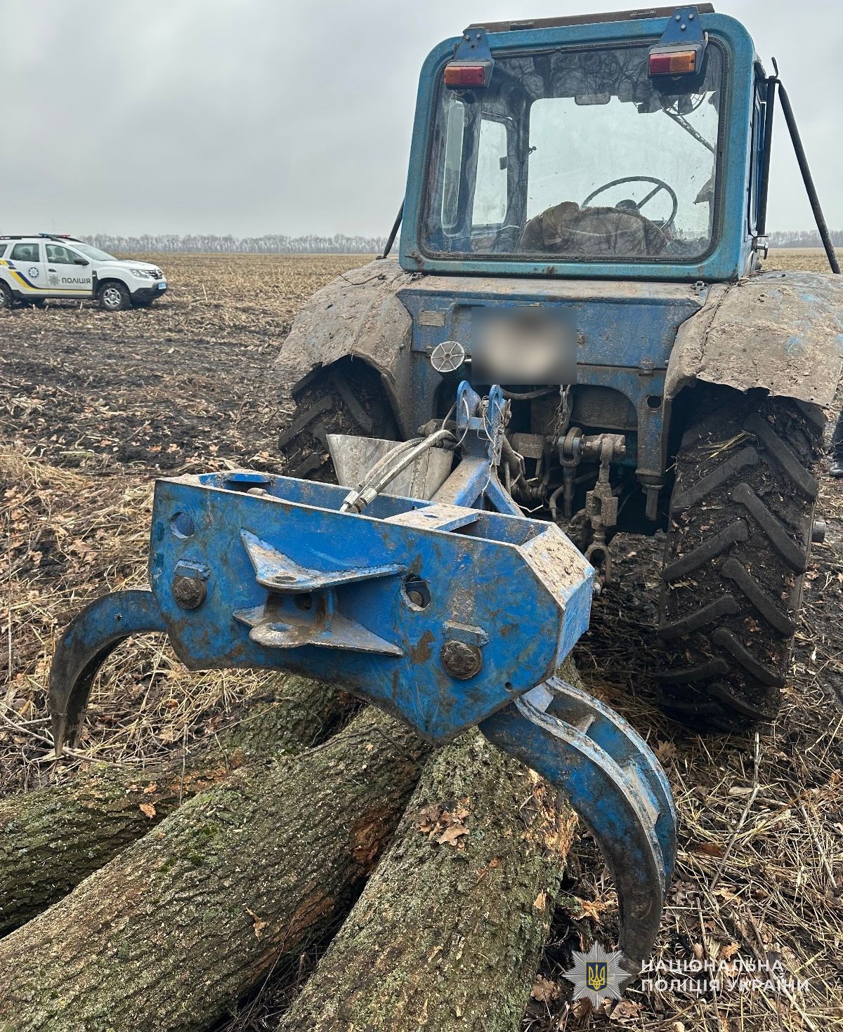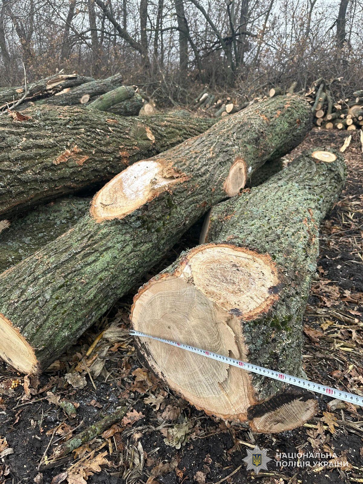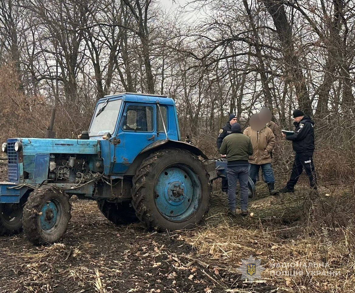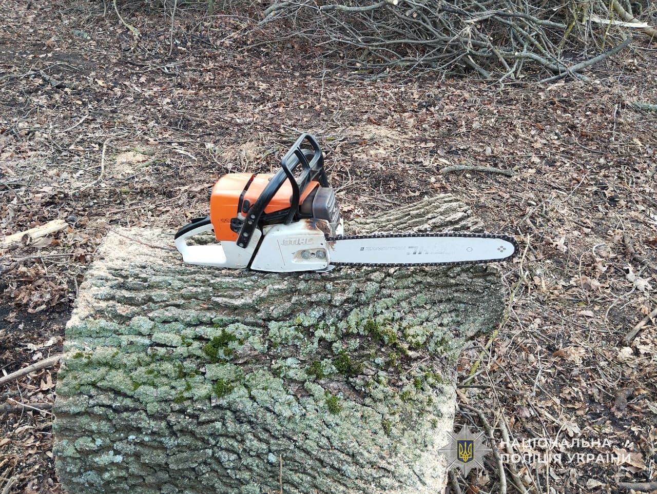 У ході огляду слідчі вилучили 32 спиляні дерева породи «дуб», бензопилу, а також трактор, на який зловмисники вже встигли завантажити декілька стовбурів для подальшого транспортування. Матеріальні збитки спричиненні неправомірними діями наразі встановлюються.