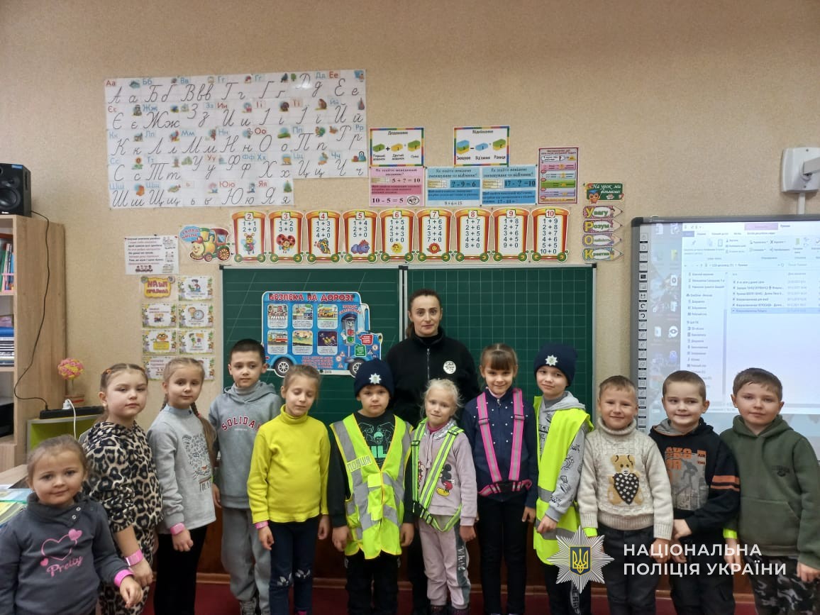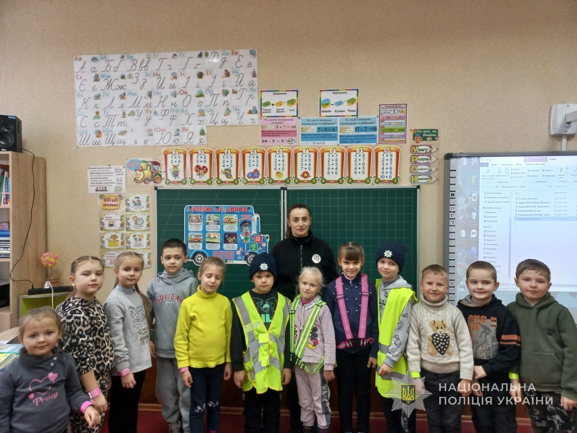 Під час профілактичного заняття правоохоронці нагадали малечі про правила безпечної поведінки на дорозі, обговорили важливість бути помітними у темряві.